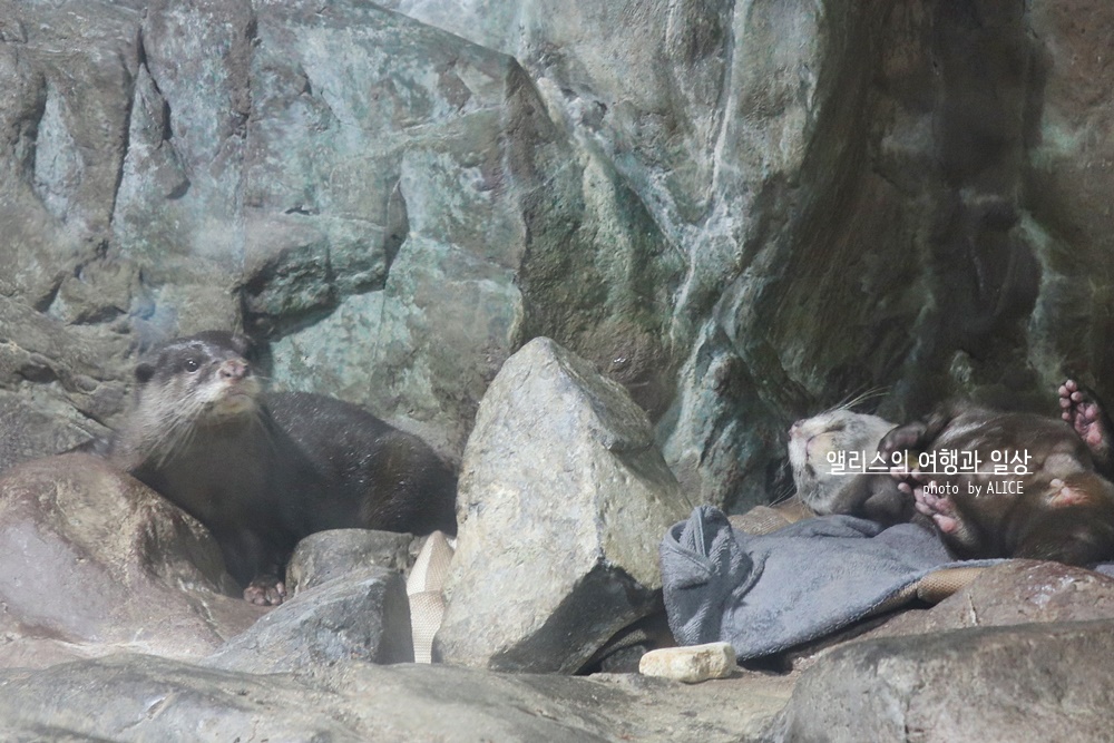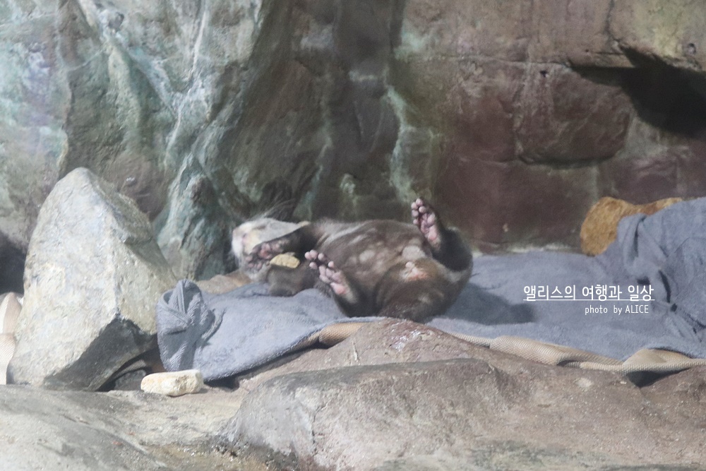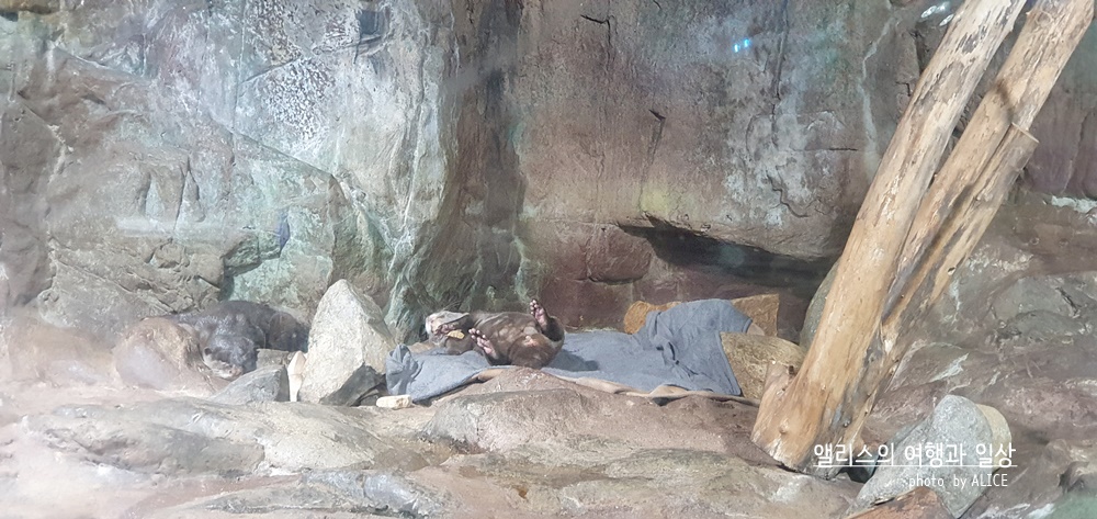 이날은 거하게 낮잠자는 수달을 볼 수 있었다. 귀여워.. 한참을 뒤집어져서 자는 수달, 그 옆에서 잠에서 깬 수달. 깨어난 수달이 자고 있던 수달 깨우는 모습도 엄청 귀여웠다.