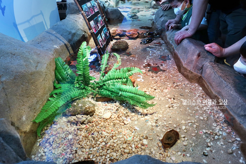 자리는 지하 3층 산호수조 앞에서 보는 것이 좋긴 하지만 그곳에도 자리가 없다면, 락풀이 있는 곳에서 테이블과 의자가 있는 곳에 앉아서 관람해도 된다.