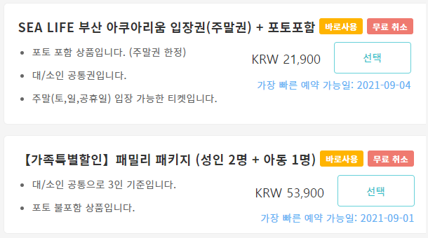 5. 주말에 성인2+아동2가 방문할 경우 kkday 패밀리 패키지 + 부산아쿠아리움 공식 홈페이지의 일반입장권 소인 예약 추천