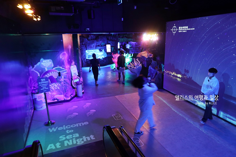 해변 · 중층 해 · 심해 등 총 3개의 전시 테마로 나뉜 공간으로 세계 일류 디지털 기술로 완벽하게 구현된 SEA AT NIGHT 존에서 해양 생태계과 심해 생물들을 구경할 수 있다. 특히 입구에는 몰디브 바드후섬이 재현되어잇는데, 미디어로 표현되는 파도에 발을 담그면 첨벙첨벙하는 화면이 만들어진다. 비록 내 피부에 닿지 않는 파도이지만 실제 내가 만드는 물장구가 표현되는 재미가 있다.