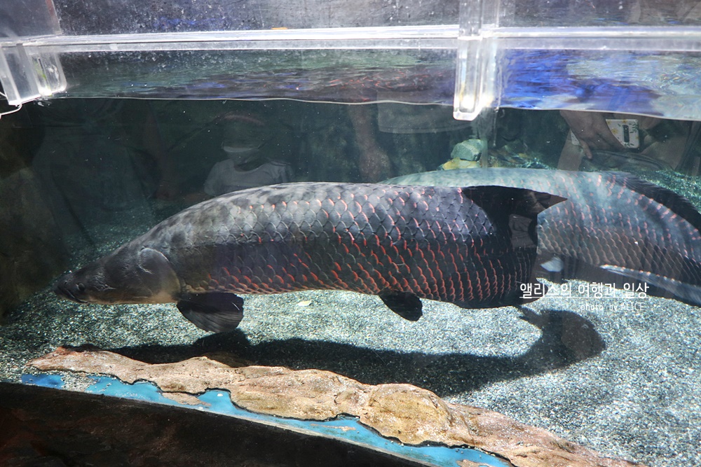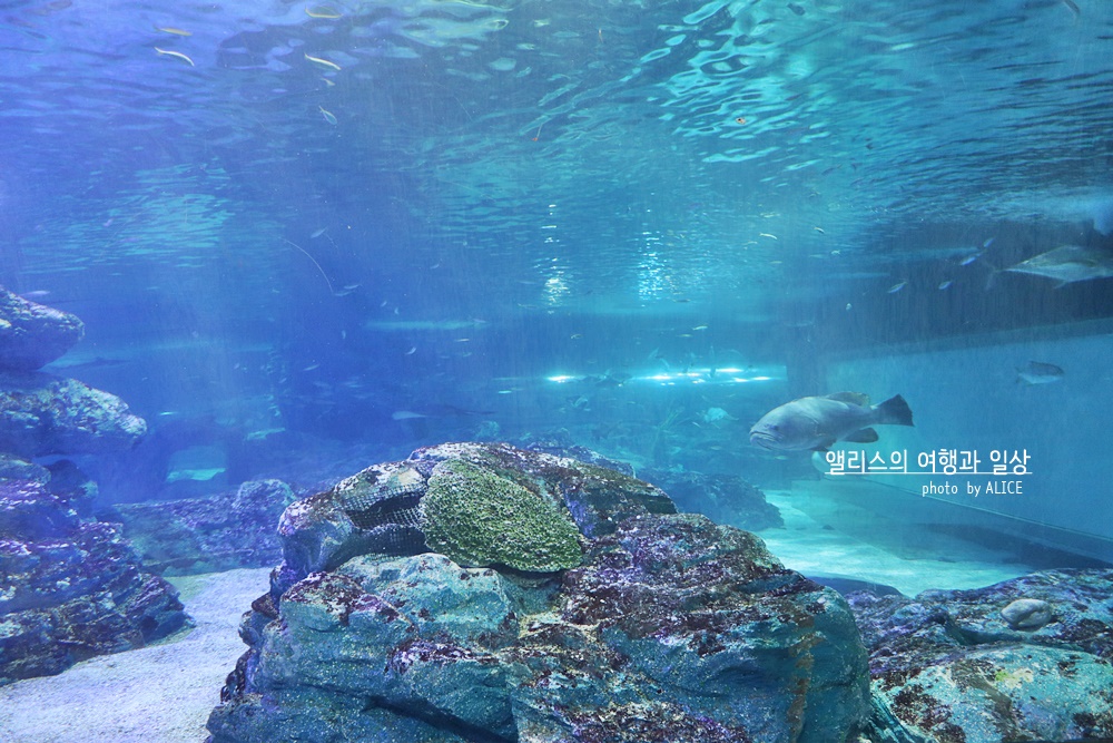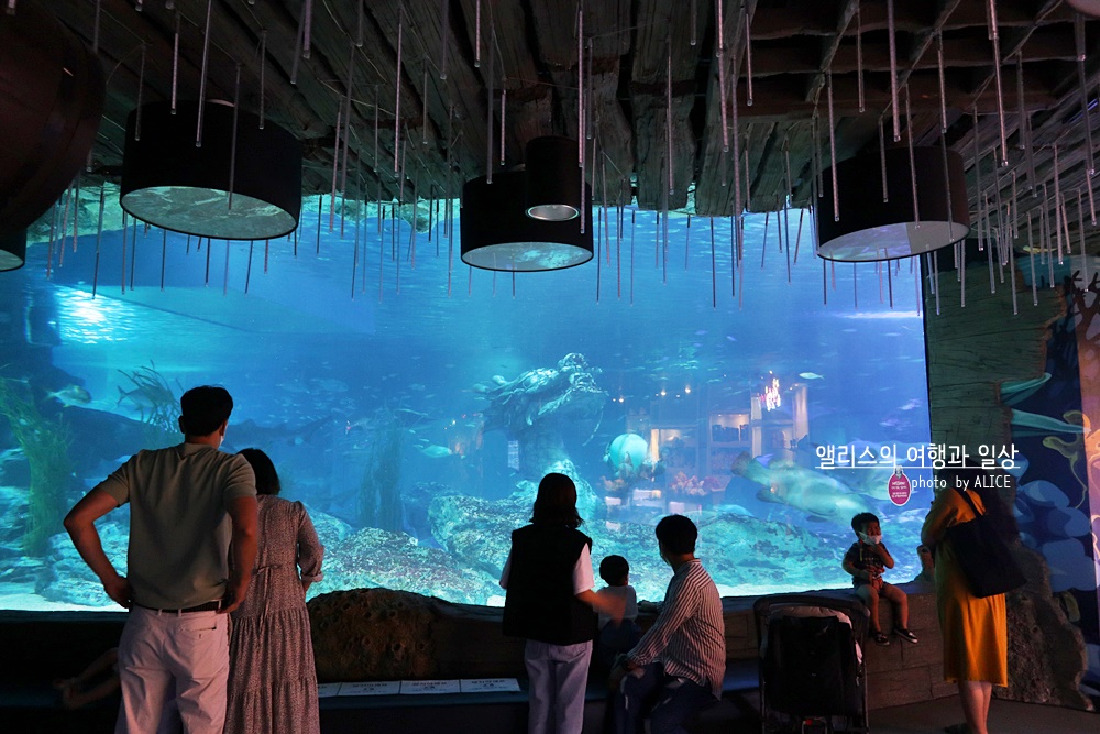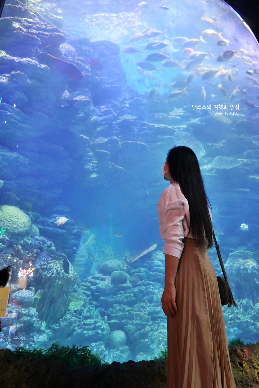 한국 영화 촬영장소로 많이 이용된, 대형 수족관 앞. 마치 환상적인 바다 속에 내가 들어가서 이들을 보는 기분이 든다. 모든 이들이 숨죽여서 이곳을 관람하는 곳이다. 그리고 아쿠아리움 곳곳에 앉아서 쉴만한 공간이 없는데, 이곳에서는 대형 스크린 화면처럼 수족관 화면 바로 앞에 누구나 앉아서 쉴 수 있는 공간이 있어서 이곳에서 잠시 쉬는 사람도 많다.