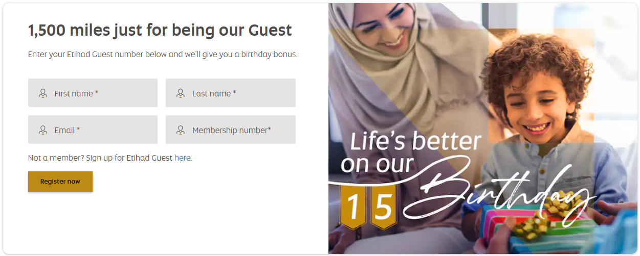 에뛰하드의 15주년 기념 이벤트, 생일 축하 보너스 적립을 받을 수 있다. 에티하드 회원(무료가입 가능)이면 누구나 적립받을 수 있으나 그냥 주지는 않는다는 점. 이벤트 페이지에서 이름과 이메일 주소, 그리고 에티하드 멤버십 회원번호를 입력해야 1,500마일리지를 받을 수 있으니 이 부분 놓치지 말자. 항상 이런 보너스 마일리지 추가 적립 이벤트는 일단 받고 보는 것이 유리하다!