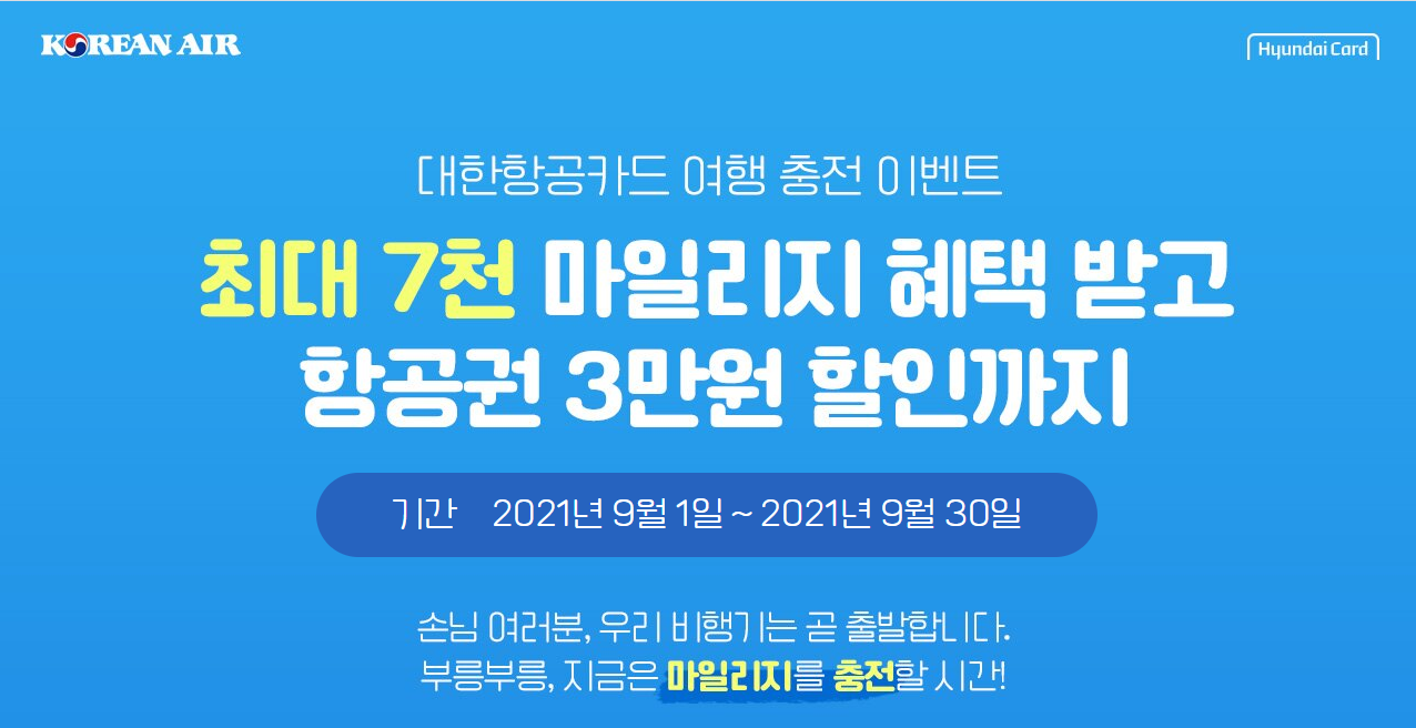 대한항공 × 현대카드, 여행충전이벤트 - 최대 7천마일리지 적립받고 항공권 3만원 할인까지 (~09.30)