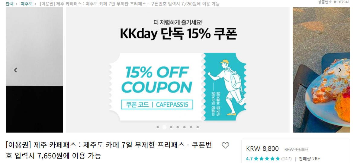 6. 제주 카페패스 7일 무제한 프리패스 (단독 최저가) + 추가 15% 할인