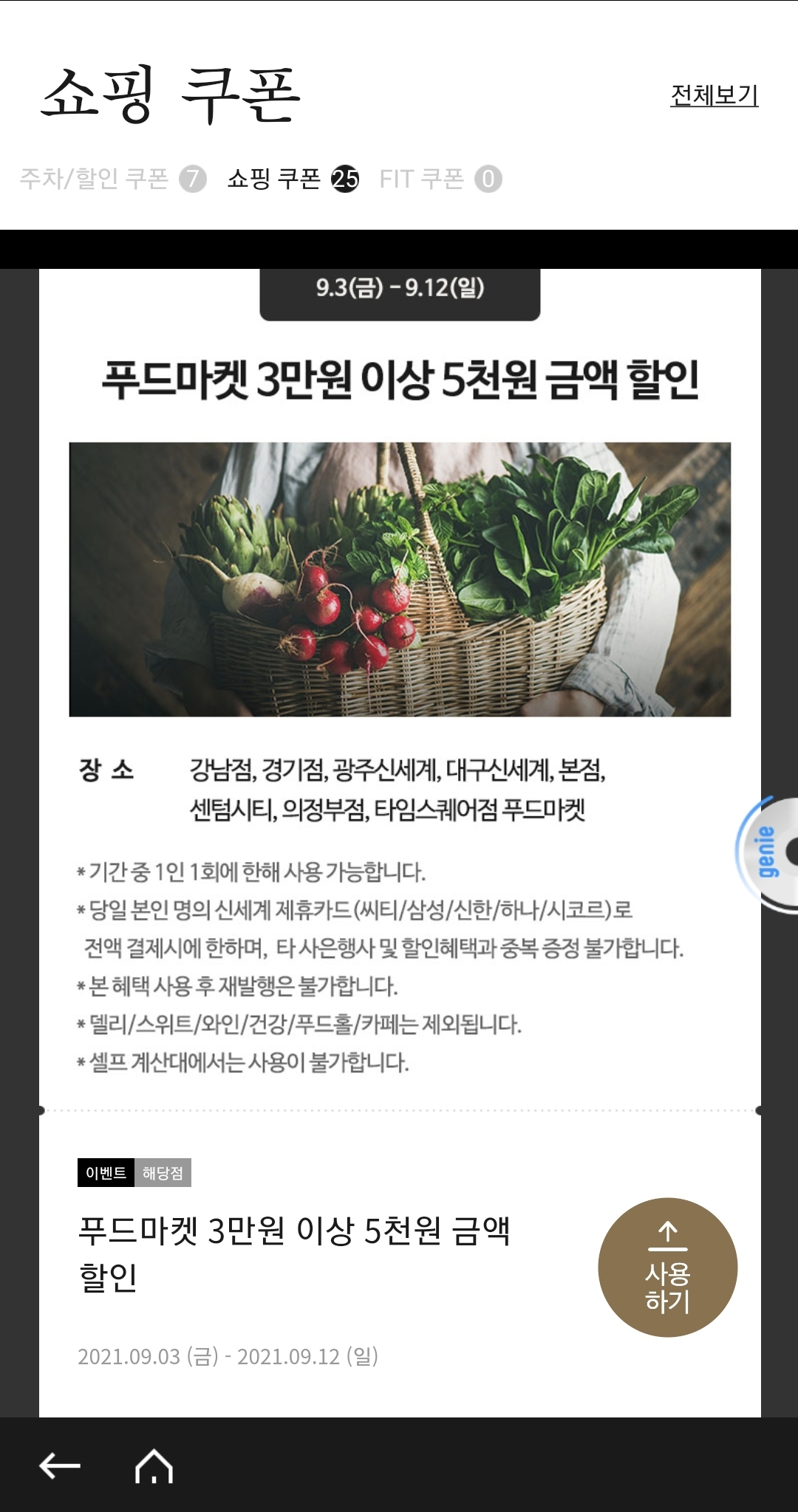 - 사용조건: 당일 신세계 제휴카드(씨티/삼성/신한/하나/시코르)로 1만원 이상 구매시 5천원 할인