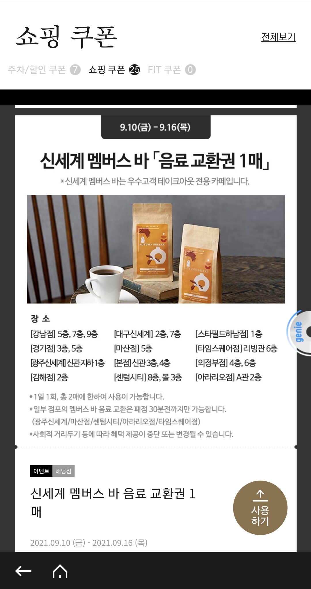 - 신세계 백화점 4종 쿠폰: 멤버스바 음료 이용권 2매/ 식사&(스위트 델리 포함) 디저트 할인쿠폰 (1만원 사용시 5천원 할인)/ 3시간 무료주차