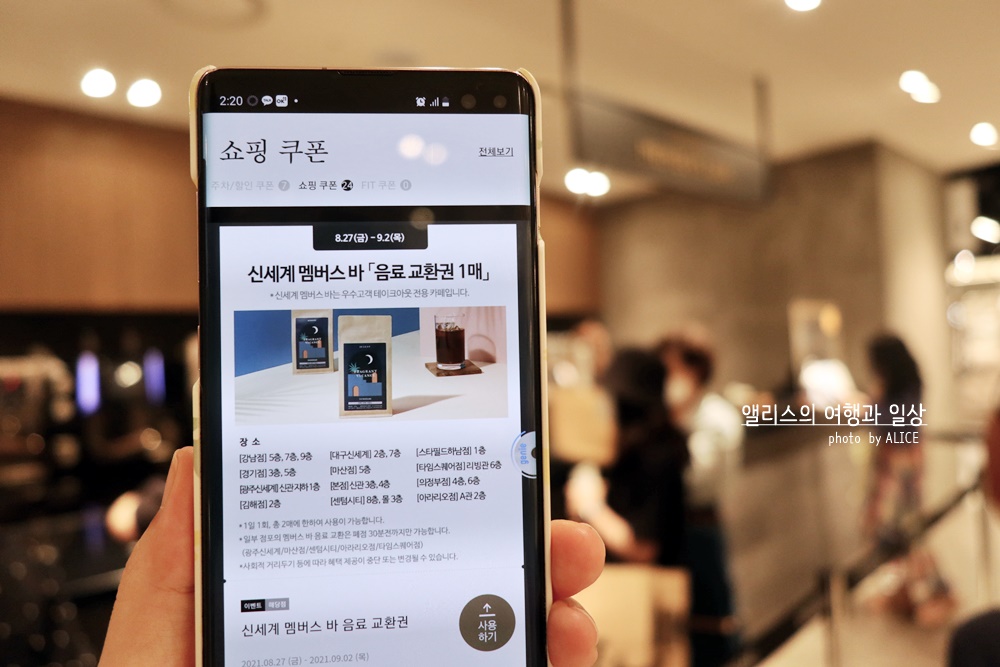신세계백화점에 매번 들르게 되면 자연스레 멤버스바로 향하게 되는건, 매달 얻을 수 있는 무료음료이용권 덕분이다. 보통 VIP고객에게 무료로 제공되는데, 매번 이벤트를 잘 활용하면 일반 고객 역시 무료 음료 이용권을 얻을 수 있다.