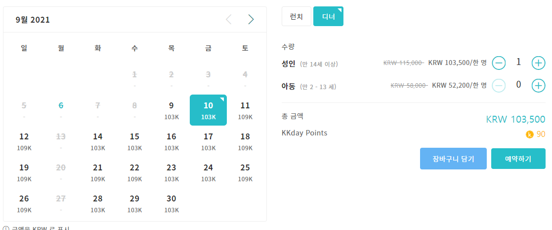 · 디너: 성인 115,000원 → 103,500원 / 소인 58,000원 → 52,200원