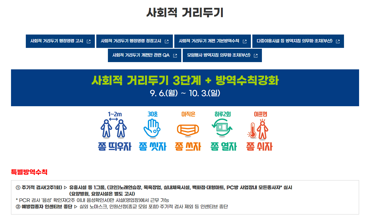 사회적 거리두기 4단계를 유지하던 부산은 2021년 9월 6일부터 사회적 거리두기가 3단계로 내려갔다. 거리두기 장기화로 인한 피로감과 예방 접종 확대, 추석 연휴 등을 종합적으로 고려해 10월3일까지 4주간 적용할 예정이라고.