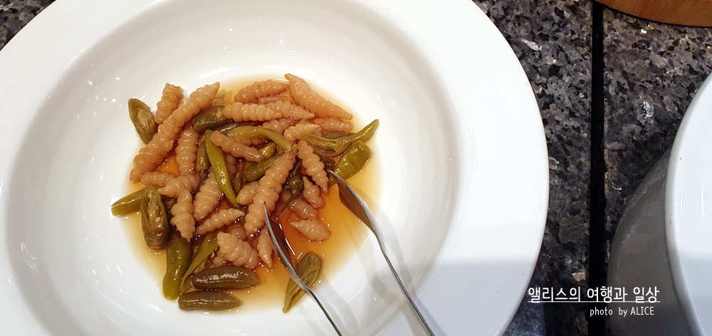 크림 파스타, 토마토 파스타, 봉골레 파스타 중 선택할 수 있다. 메뉴를 선택하면 알아서 만들어주시는데, 내가 선택한 것은 토마토 파스타. 항상 어느 뷔페를 가든지 토마토 파스타를 선택하고 맛보는데 각 뷔페마다 맛이 모두 색다르다는 것이 특징이다. 내가 좋아하는 뷔페 중 하나인 부산 코도모 호텔의 뷔페에서는 굉장히 얇은 소면으로 토마토 파스타를 만들어주는 데 그맛이 매우 독특하다. 이곳은 일반적인 파스타면을 사용하는데, 신맛이 강하지 않아서 먹기 부담없다는 점이 특징이었다.