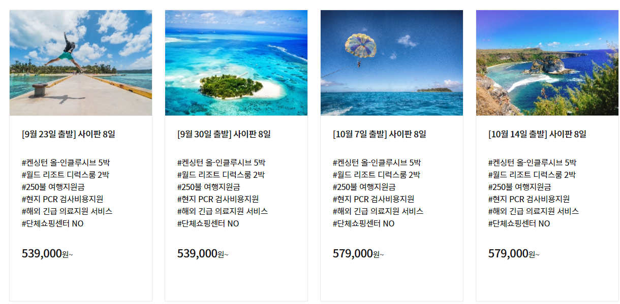 그러므로 백신접종이 완료된 사람 중, 사이판 현지에서 5박의 자가격리를 해도 괜찮다는 분들이라면, 이번 기회에 사이판 정부의 지원을 받으며 사이판에 방문해보는 것도 좋을 것 같아요. 상품예약은 각 여행사마다 모두 사이판 패키지로 판매하고 있으니 평소에 이용하던 여행사 또는 인터넷 검색으로 예약가능합니다.