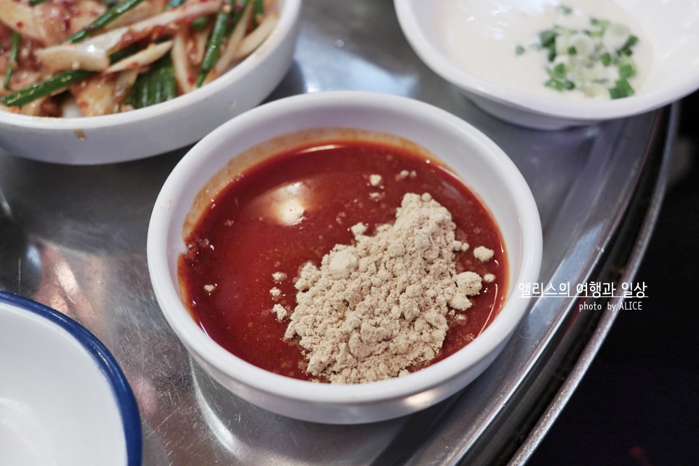 둥글게 말리어도 크게 신경쓰지 않아도 된다. 돼지 껍데기는 그냥 올려두면 알아서 잘 익히는 고기니까. 잘 익은 돼지 껍데기를 한점 들어 그대로 먹어도 좋다. 고소하고 쫄깃한 것이 특징. 여기에 추가로 빨간색 소스에 콩가루와 함께 찍어먹어도 색다르게 좋다. 새콤한 양념에 고소한 콩가루, 쫄깃한 돼지 껍데기 덕분에 식감도 맛도 동시에 만족스러웠다!
