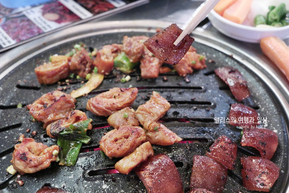 막창 양념구이는 초벌구이가 된 상태로 나오기 때문에 오래 구울 필요가 없었다. 오래 구우면 타니까 적당히 잘 익은 상태라면 바로 먹으면 된다. 집게로 슥슥 비벼가면서 구워낵 막창 양념구이는 물론 함께 재워진 양파, 대파, 마늘도 잘 익혀주면 된다. 막창 특유의 쫄깃한 식감은 물론 정말 야들야들한 그 맛은 정말 최고...!