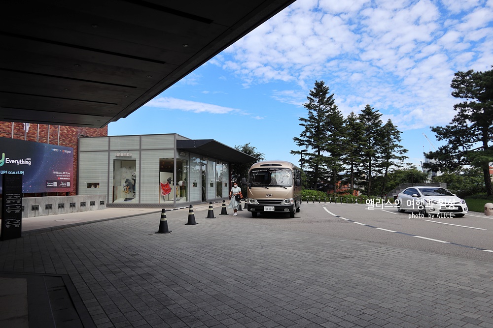 셔틀버스 탑승장소는 정문을 등지고 섰을 때 (분수를 정면으로 바라봤을 때) 왼쪽에 셔틀버스 탑승 장소가 있다. (에르메스 매장에 가까움)