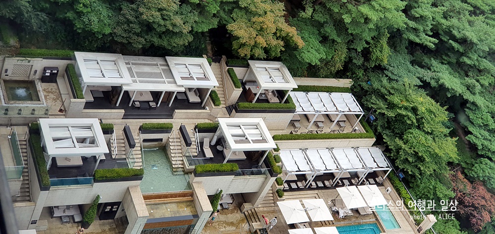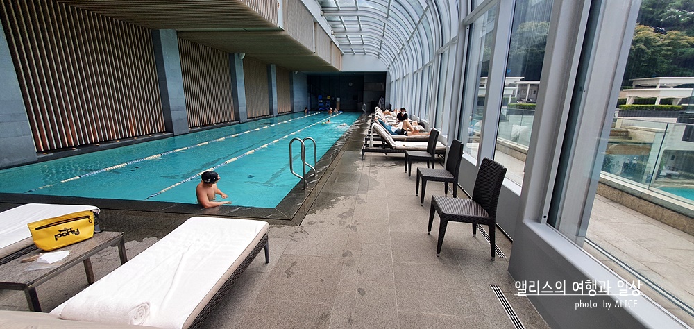 유리돔으로 되어있는 것이 특징인 서울 신라호텔 실내 수영장. 유리돔 너머의 남산 전경을 볼 수 있으면서 길죽한 풀장과 건식 사우나, 실내/야외 자쿠지가 있다. 별도의 락커룸도 이용할 수 있다는 장점도 크다.