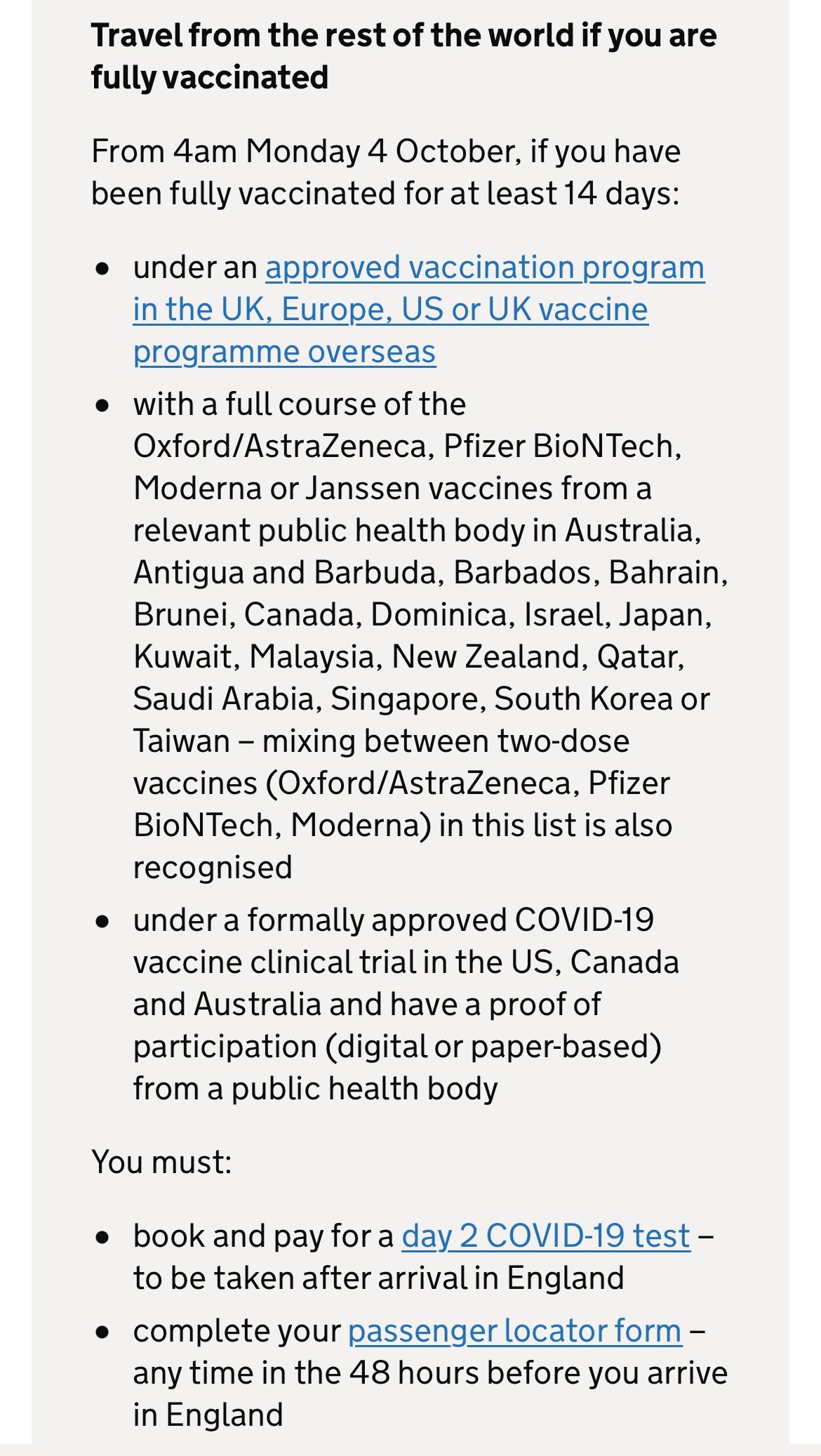 영국 입국 시 필요한 서류 체크리스트, 자가격리 5일만 하는 방법(TTR)등을 정리한 지 얼마 되지 않아 한국에서 백신접종을 완료한 자에 한해 자가격리를 면제하는 계획이 발표되었다. 정확하게 말하면 잉글랜드 지역의 경우 백신접종 완료시 자가격리가 면제된다. 2021년 10월 4일 이 규정이 적용되며, 백신 접종완료 + 레드리스트 국가 체류가 아닐 시 (레드 리스트 제외 국가 어디서든 출발해도) 잉글랜드 입국시 자가격리 면제된다. 한국에서 백신 맞은거도(화/모/얀/아젠) 이제 인정된다.