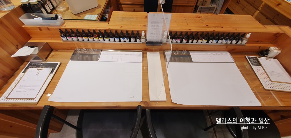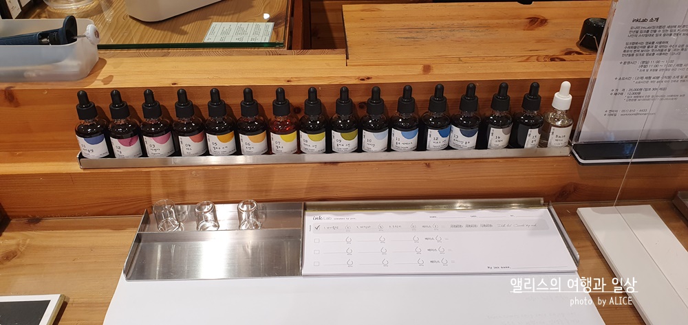 이곳에서는 다양한 색상의 잉크를 조합해 세상에 하나뿐인 나만의 잉크색상을 만들 수 있다. 직접 만든 잉크 배합 기록은 데이터베이스에 저장되어 이후에도 재구매 가능하다고. 체험 가능한 횟수는 1일 4회이며, 한 타임 당 4명까지 잉크를 만들 수 있다. 여러 잉크 중 원하는 색을 2~4가지 고른 뒤 비커에 넣고 섞는다. 원하는 색이 만들어지면 잉크 이름을 지어 색상 표를 직원에게 제출하면 된다. 시간은 30분 정도 소요된다고.