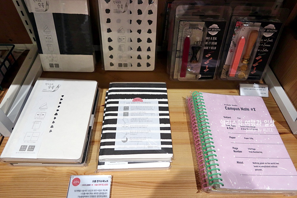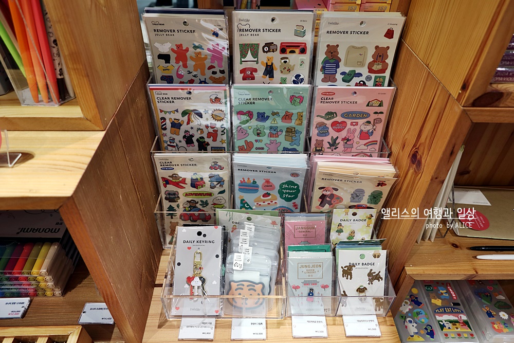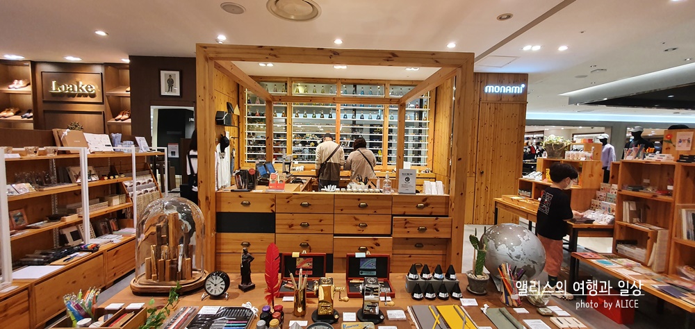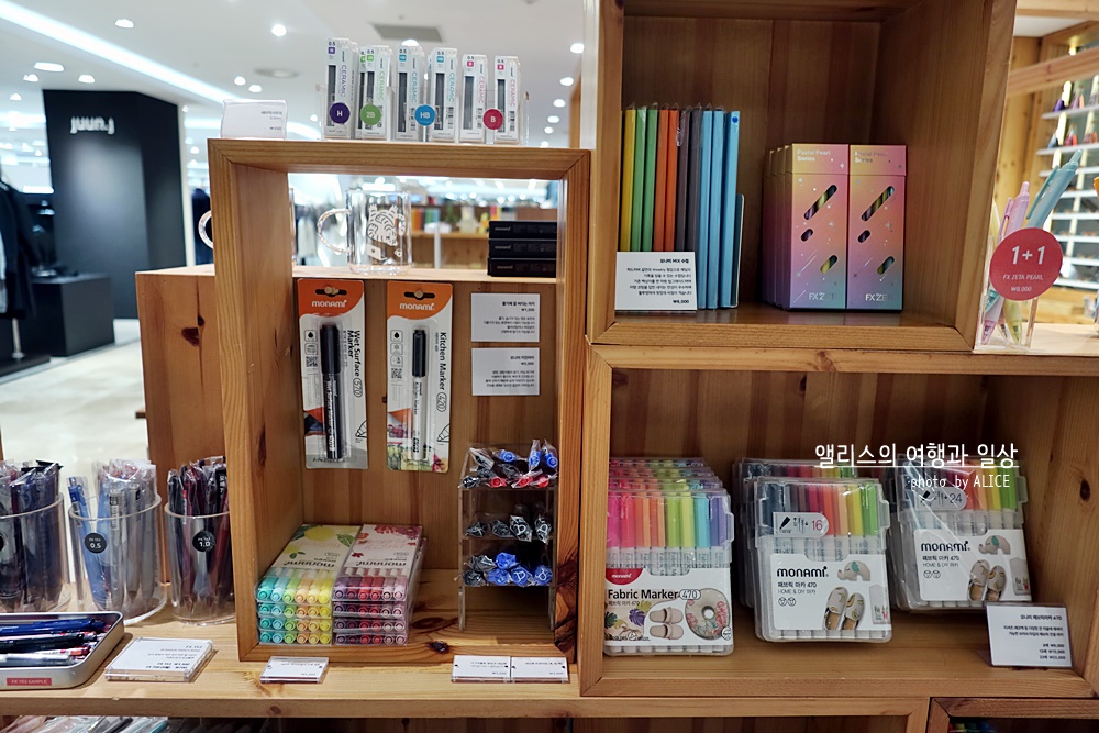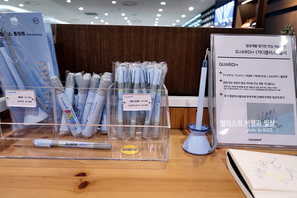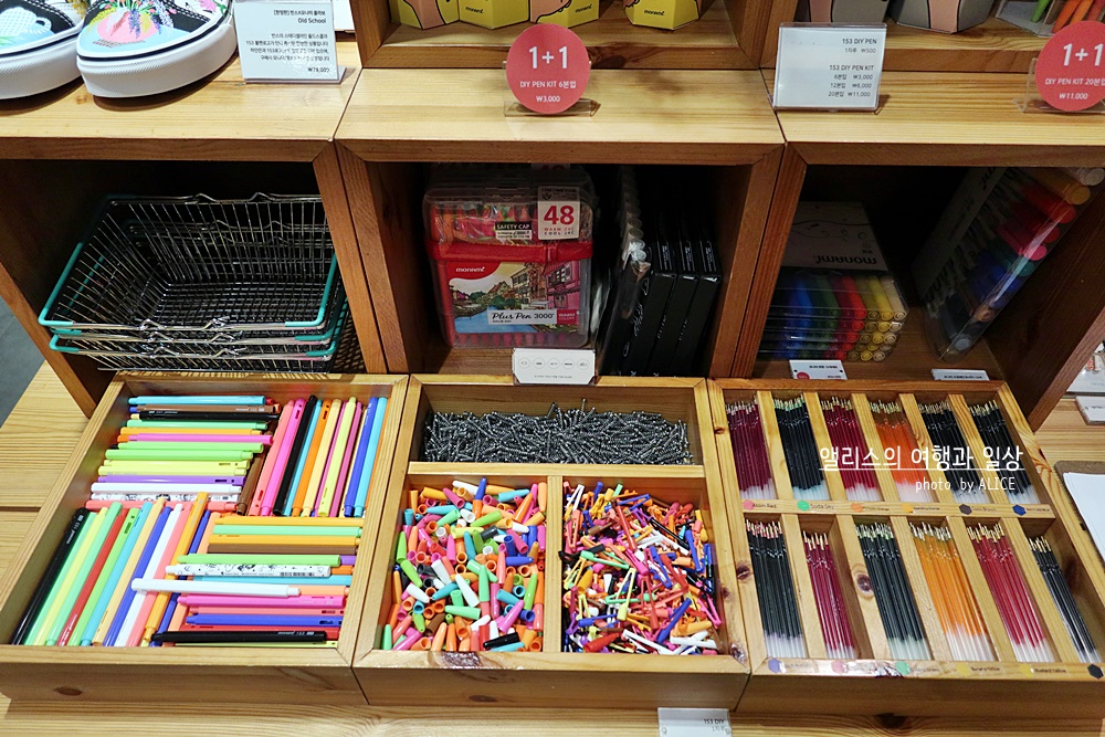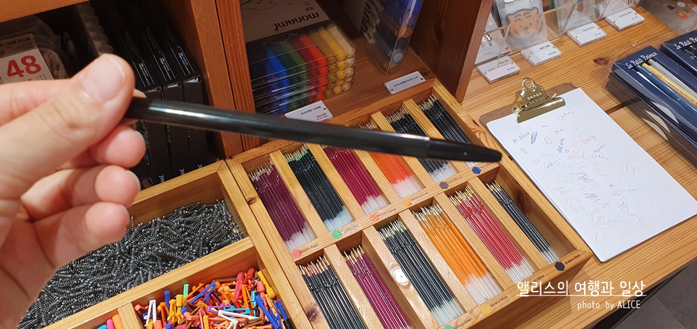 모나미의 기본 펜 케이스를 자신의 취향껏 색상을 선택해서 조립해서 구매할 수 있다. 개당 500원. 나는 이전부터 이 코너에 들러서 올블랙 모나미 펜을 만들고 싶었다. 가격도 부담없는 500원! 검은색 볼펜꼭지, 검은색 볼펜심, 검은색 몸통, 검은색 버튼까지 모두 조합해서 올블랙 완성. 계산대에 500원 결제하고 내 것으로 완성되었다. 부담없는 가격이라 그런지 취향껏 제작하여 주변에 가벼운 선물용으로 선택하는 이들도 많았다.