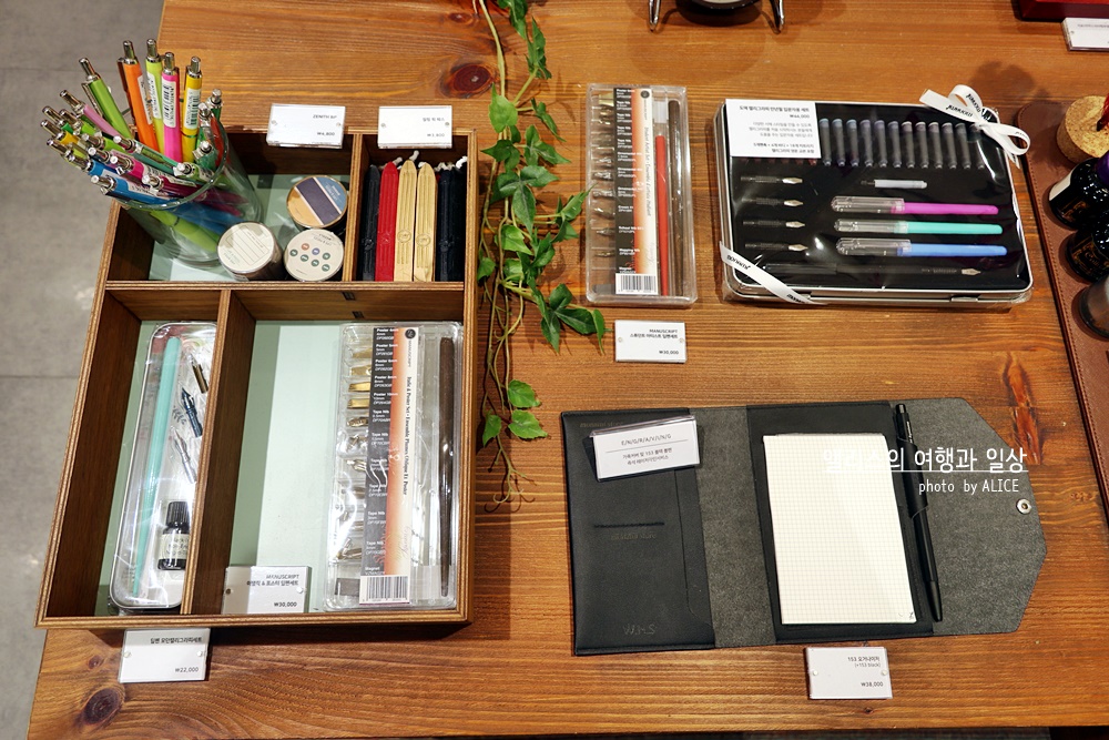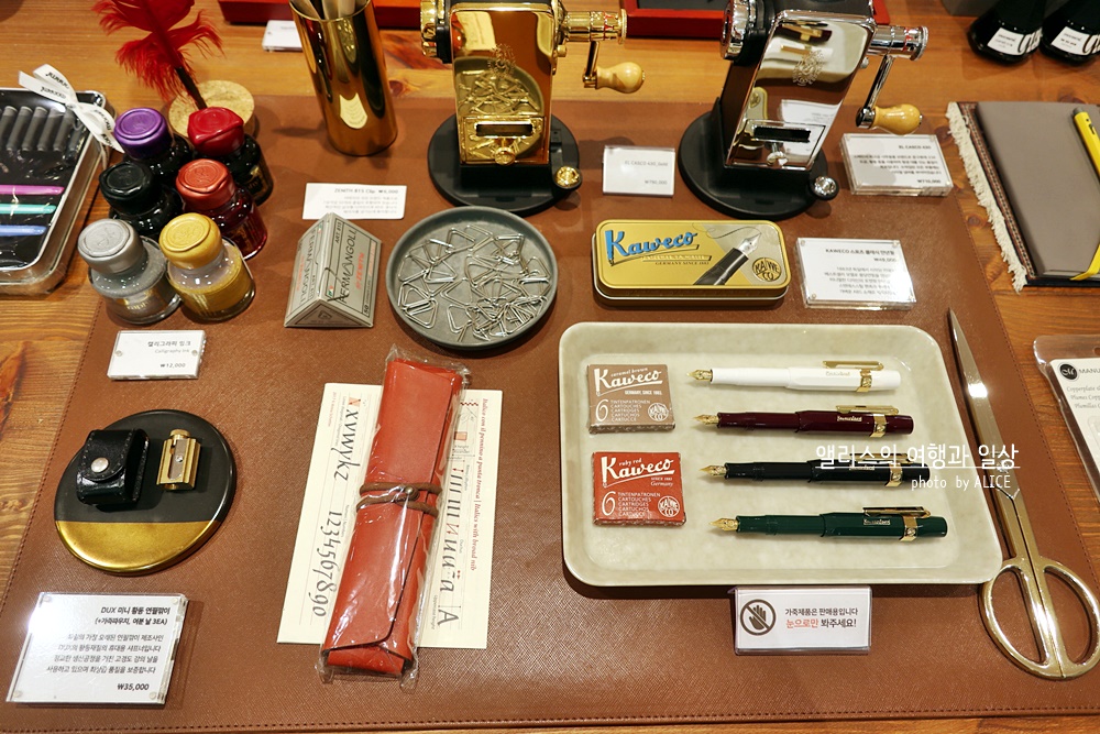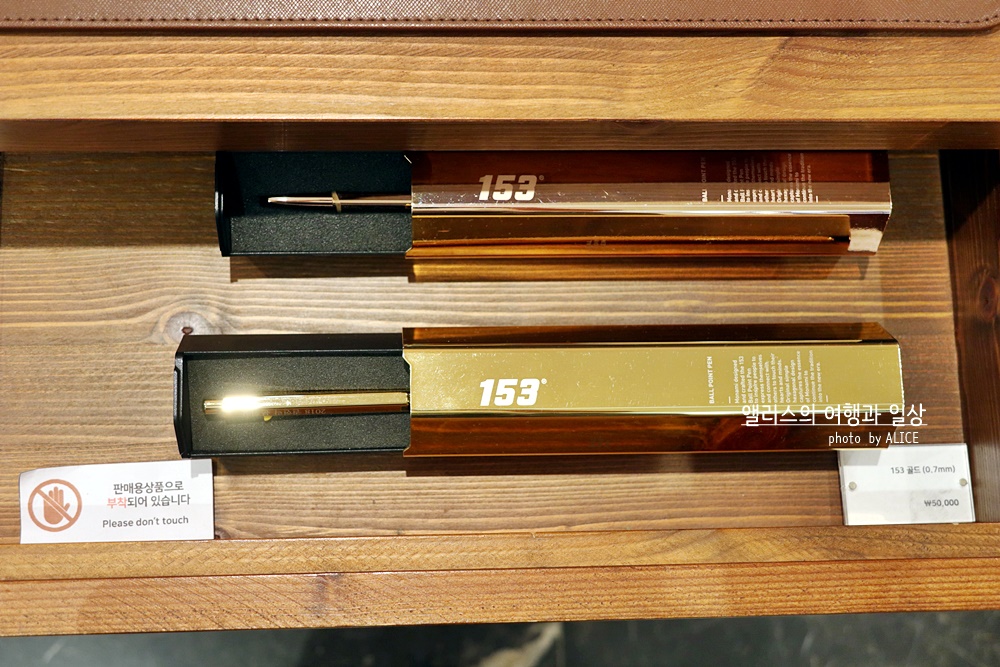 만년필과 고급 필기구 제품에 원하는 문구를 각인할 수도 있다. 왼손잡이인지 오른손잡이인지, 평소 펜을 어떻게 잡고 쓰는지를 꼼꼼하게 살펴보며 잘 보이는 위치에 레이저 각인을 해주니 상당히 섬세한 서비스다. 영문은 물론 한글로도 각인이 가능해 외국인 관광객 사이에서 기념품으로도 인기가 많다고!