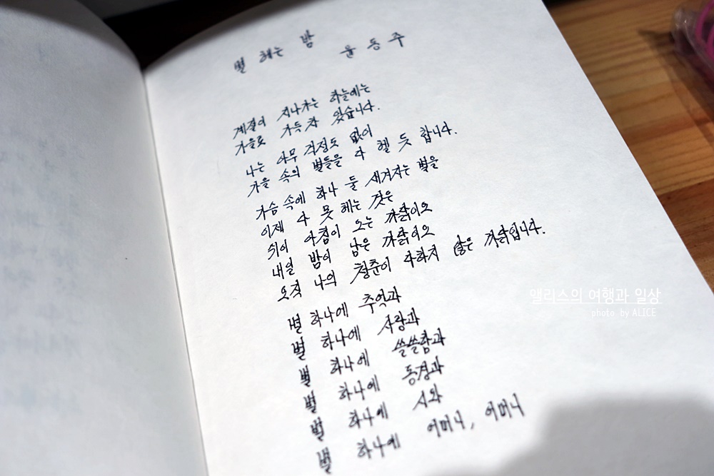 한지로 채워진 노트인데 확실히 질감이 남달랐다. 여기에 예쁜 글씨로 해겨보는 글이라니. 매력적이다.