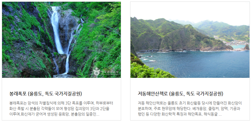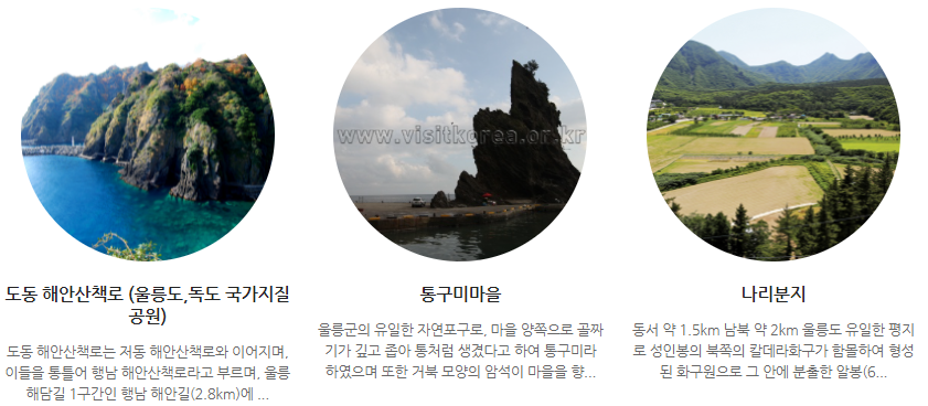 울릉도 육로관광 A코스 - 약 4시간(도동-통구미-사자바위-투구봉-곰바위-태하-송곳봉-나리분지-삼선암-도동)