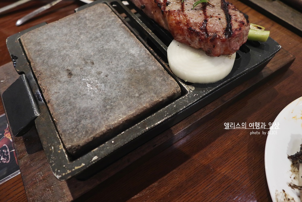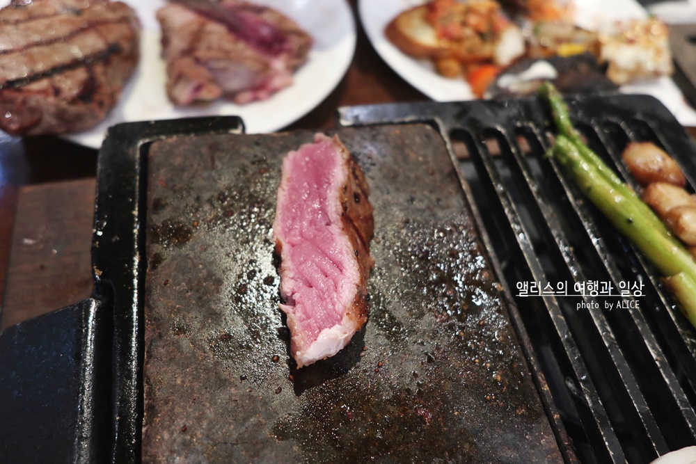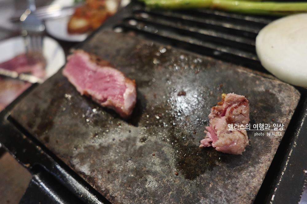 이게 레어로 나오기 때문에 고기가 잘 잘리지 않는다. 그게 정말 힘들었는데, 어쨌든 적절한 크기로 잘라서 돌 판위에 구워 먹으면 된다. 위 사진처럼. 초반에 잘 구워지는 게 재미있었다. 너무 오래두면 탈 수 있으니 조심하시길! 돌판에 내가 원하는 굽기로 구워먹는데 꿀맛. 아주아주 꿀맛. 다른 테이블에서도 스모크 얌스톤 주문했는데 냄새가 아주 예술이었다. 빕스가면 꼭 얌스톤 주문해서 드시길!!!