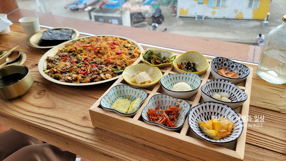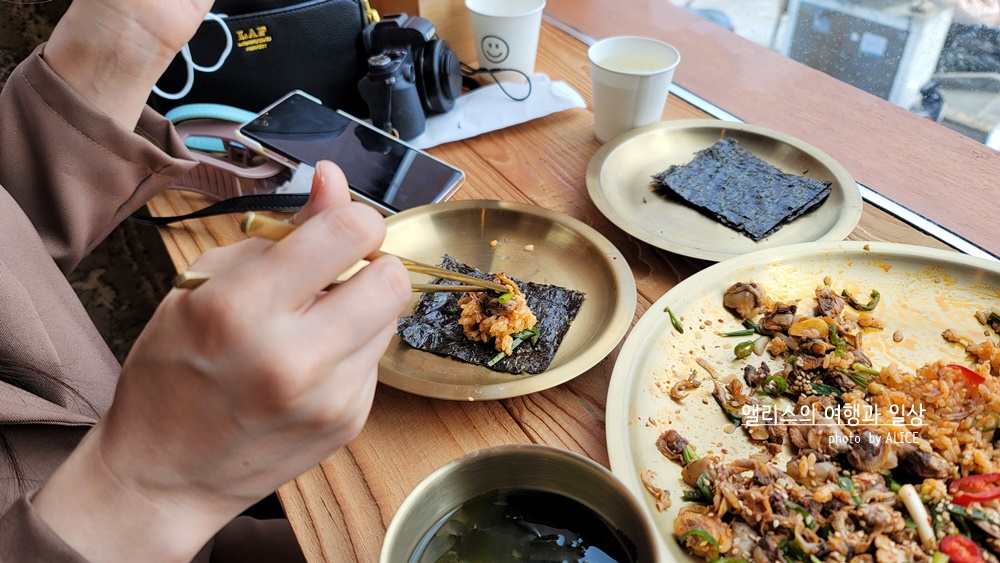 김을 사랑하는 나는 김에 밥과 꼬막을 올리고 고명으로 나온 고추와 쪽파등을 야무지게 올려서 김에 싸먹었다. 맛은 당연히 좋았다. 밥보다 양 많은 꼬막에 볶은 밥과 함께 먹는 이 맛. 여기에 뷰맛집이라는 장점까지 더하니 기분도 좋았다. 탁트인 바다 앞에서, 바다내음을 품은 꼬막에 든든한 식사를 할 수 있는 이 시간이 행복했다.