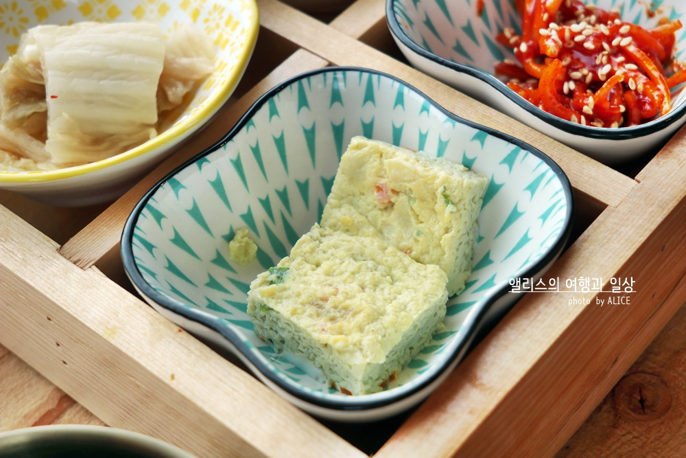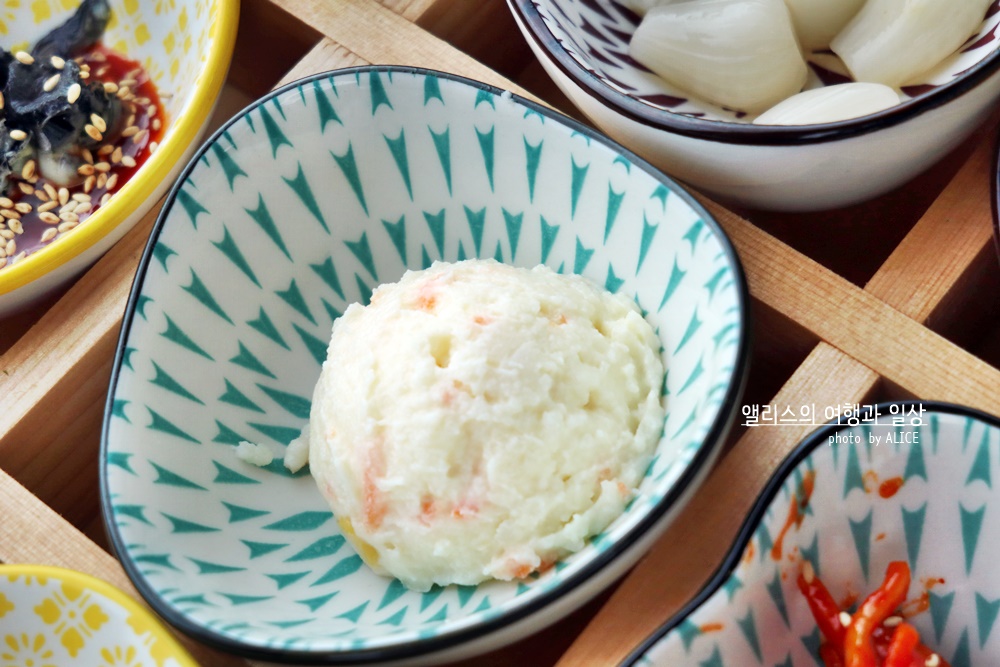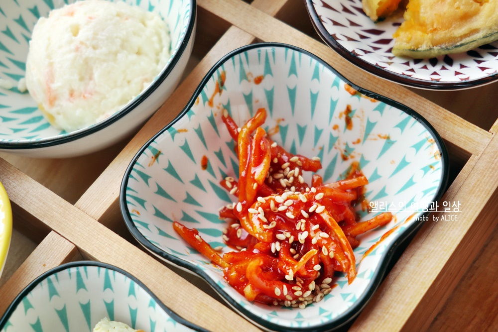 계란찜, 진미채, 단호박튀김, 백김치, 감자샐러드, 락교, 무생채, 미역줄기무침, 논고동