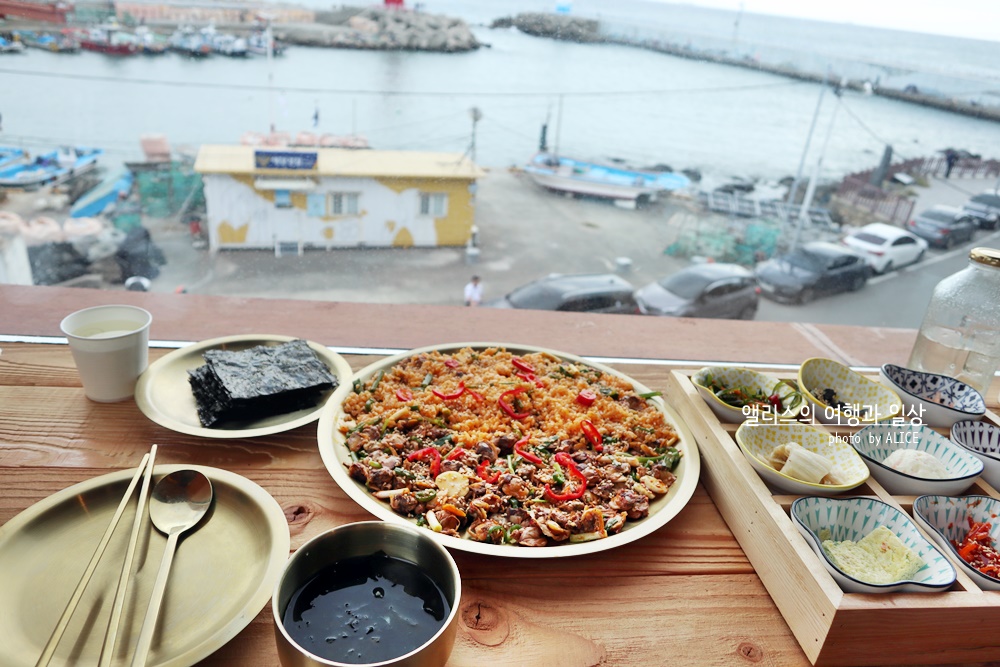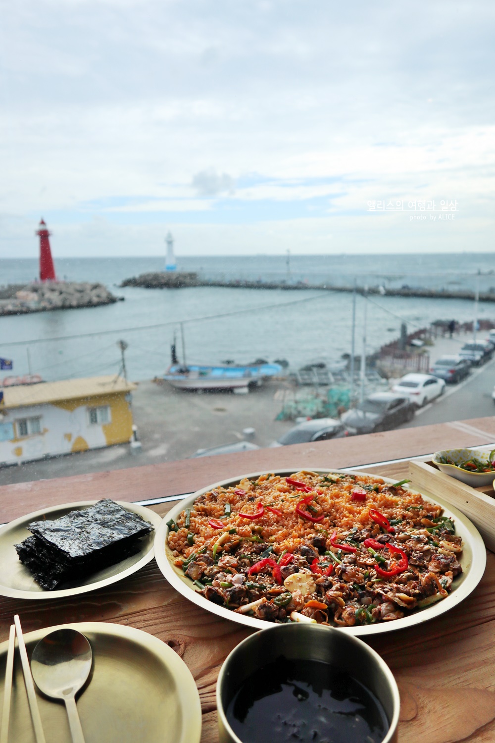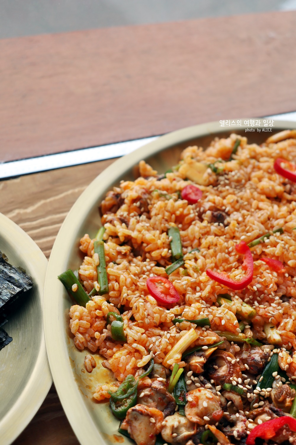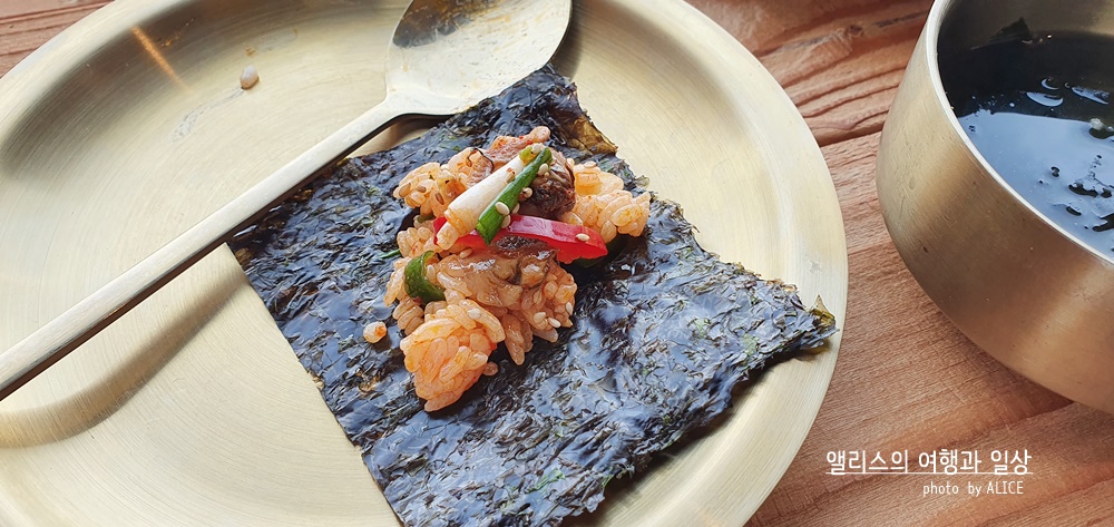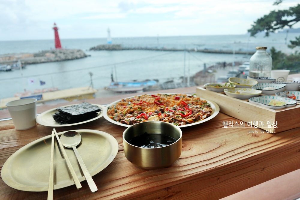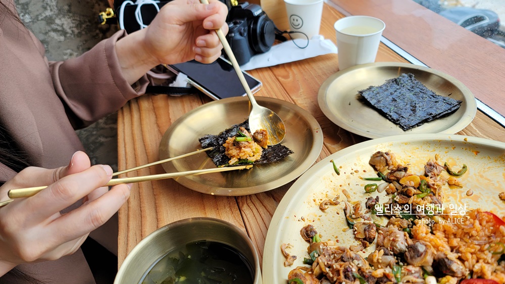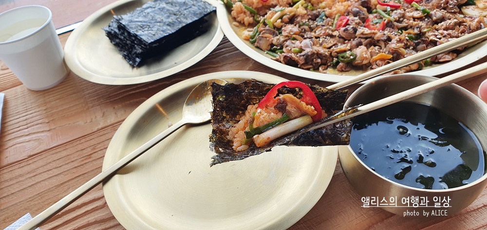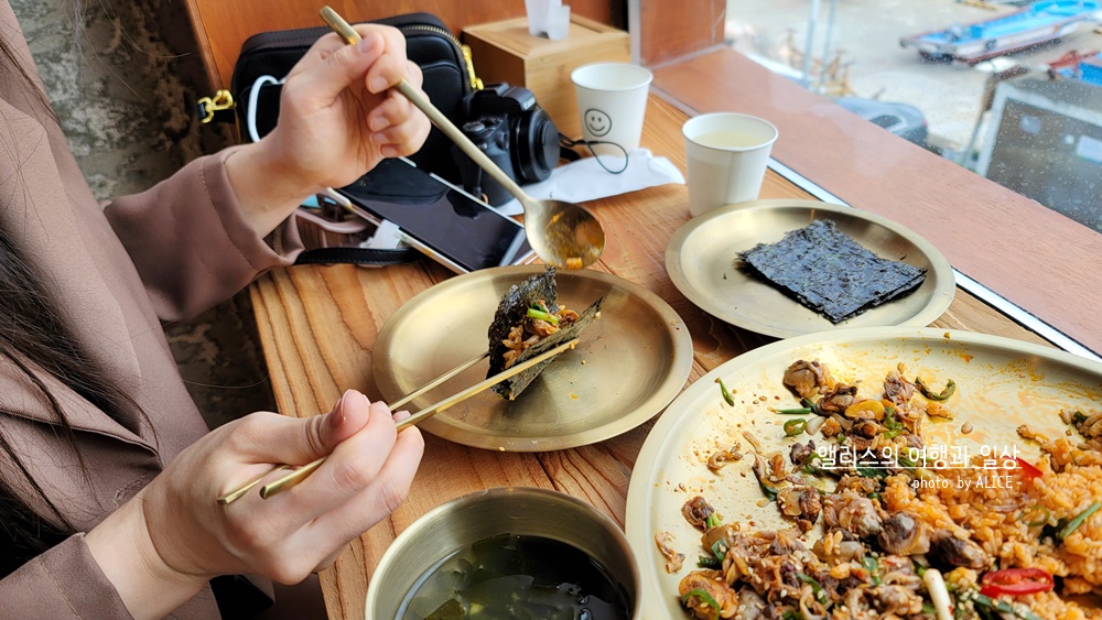 김을 사랑하는 나는 김에 밥과 꼬막을 올리고 고명으로 나온 고추와 쪽파등을 야무지게 올려서 김에 싸먹었다. 맛은 당연히 좋았다. 밥보다 양 많은 꼬막에 볶은 밥과 함께 먹는 이 맛. 여기에 뷰맛집이라는 장점까지 더하니 기분도 좋았다. 탁트인 바다 앞에서, 바다내음을 품은 꼬막에 든든한 식사를 할 수 있는 이 시간이 행복했다.
