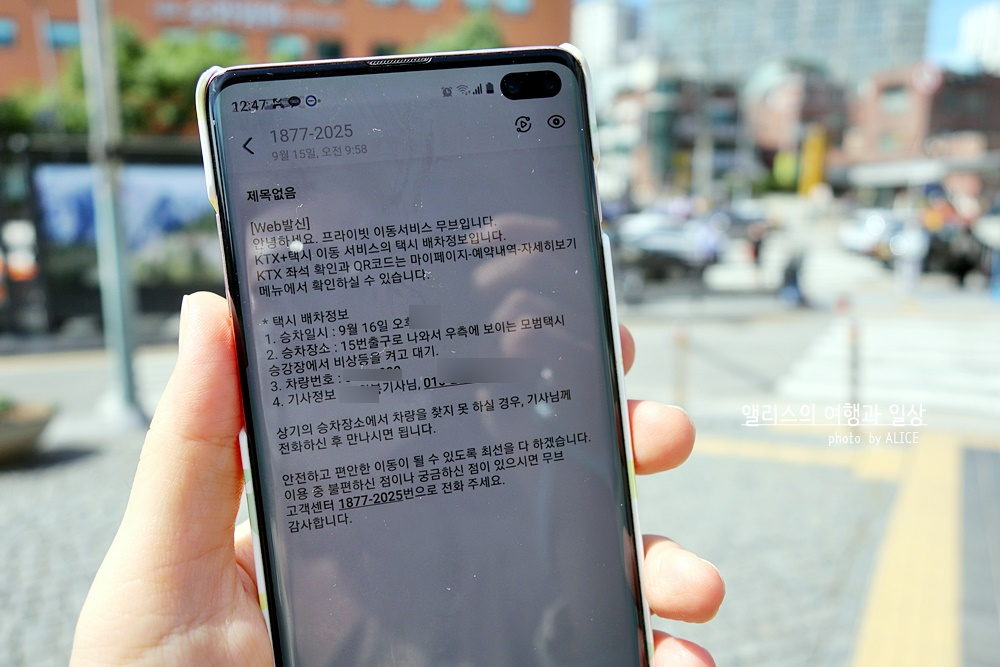 서울역에서 만나 탑승하게 될 택시/승합차의 정보는 하루 전날 문자로 도착한다. 물론 예약한 무브 어플에서도 정보를 확인할 수 있으며, 탑승시간 전에 미리 어플을 통해서 알림이 나가기도 한다. 다만 이번에 아쉬웠던 점은 차량번호 정보가 분명 바뀌었음에도 무브 고객센터에서는 나에게 탑승할, 바뀐 차량번호를 알려주지 않았다. 그러니 변경되기 전 택시 정보만 가지고 한참을 기다려도 보이지 않아 기사님께 전화를 하니 (사전정보로 기사님 번호를 알려준다.) 차량번호가 바뀌었다고 알려주셨고 다행히 기사님과 통화했기에 만날 수 있었다.