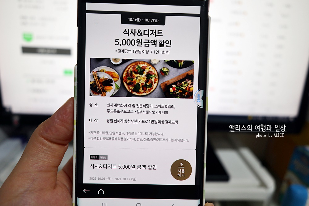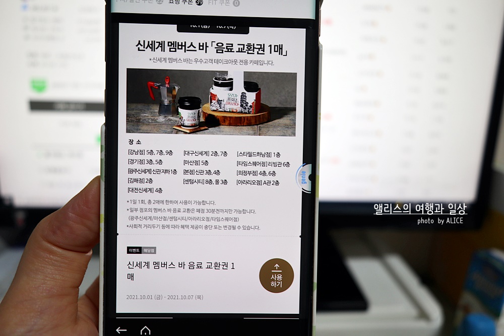 활용도가 매우 높은 신세계 백화점 할인쿠폰. 매달 잘 찾으면 사용하기 편리하고 무엇보다도 무료주차 3시간은 물론 신세계 백화점 각 지점에서 1만원 식사/디저트 이용시 5천원 할인이라는 유용한 할인율, 여기에 추가로 멤버스바에서 무료 음료까지! 진짜 알찬 쿠폰이라 매달 활용하는 편이다.