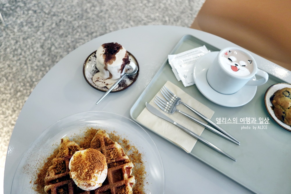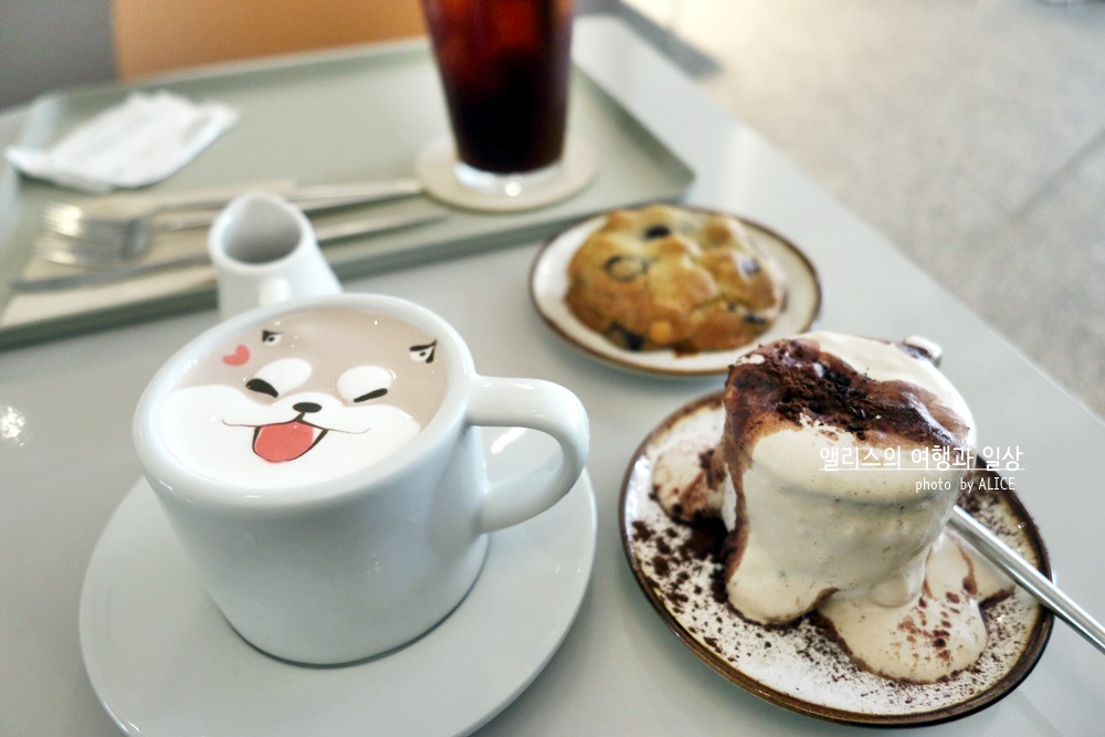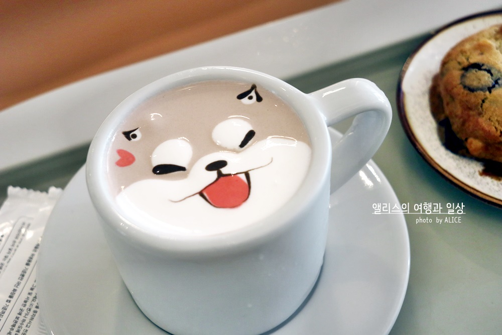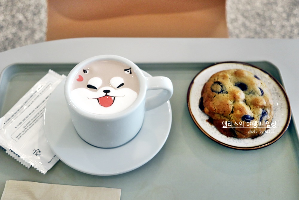 그러니 나 역시 주문한 메뉴는 크리마트가 포함되는 것은 당연. 그림은 귀여운 시바견으로 골랐다. 고양이도 정말 예뻤지만 나는 강쥐를 조금 더 좋아하므로 시바견으로 당첨! 이에 함께 주문한 더티커피와 빵가루와 함께하는 바삭한 크로플과 쿠키, 여기에 깔끔한 아메리카노까지 주문했다.