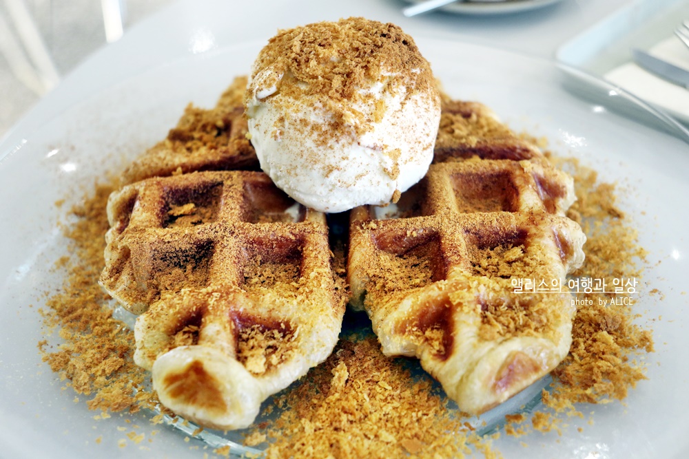이곳 사장님이 직접 적은, "당신은 단언컨대 SNS에 인생크로플이라고 올릴 것이다." 라고 적힌 메뉴판의 글귀처럼 이곳 인생 크로플 맞다. 몇군데의 크로플도 먹어보고 직접 만들어도 먹어보고 유명하다는 카페에서도 먹어봤지만 크로플 무난했다. 다들. 그런데 여기는 한 입 먹고 '크로플 안에 인절미같은 떡을 넣었나?' 싶어 크로플 안을 굳이 들여다봤다.. 그만큼 쫄깃했고 부드러웠고, 빵가루+시나몬의 맛은 매력적이기까지 했다. 바삭한데 쫄깃한 그 맛. 사랑해! ㅋㅋ