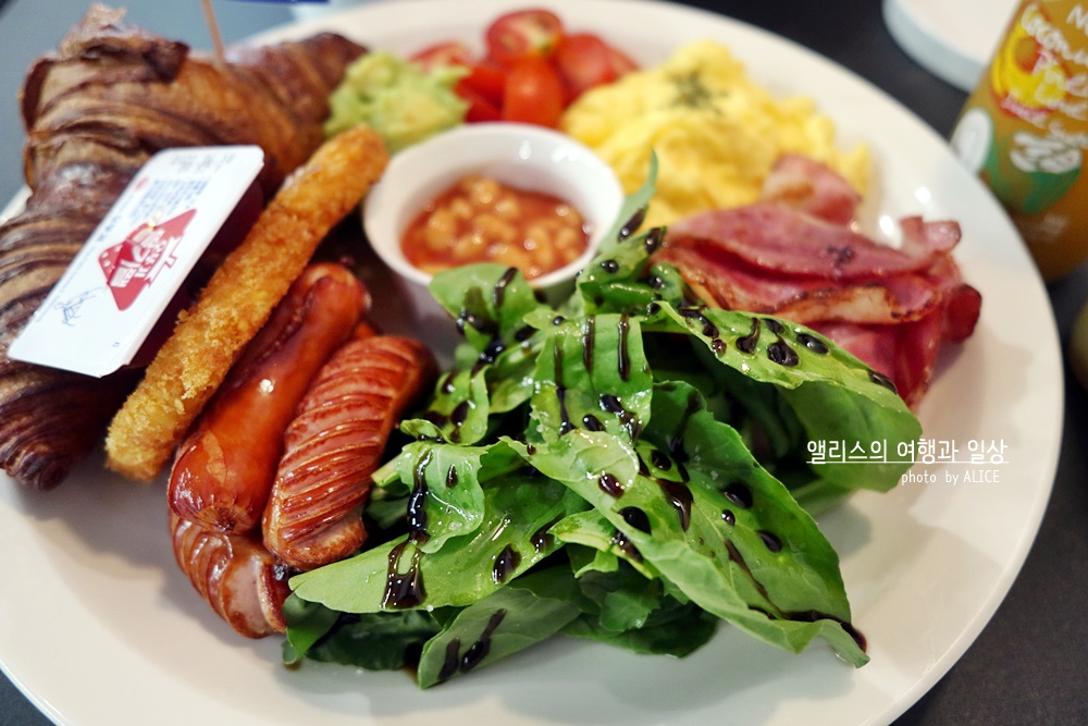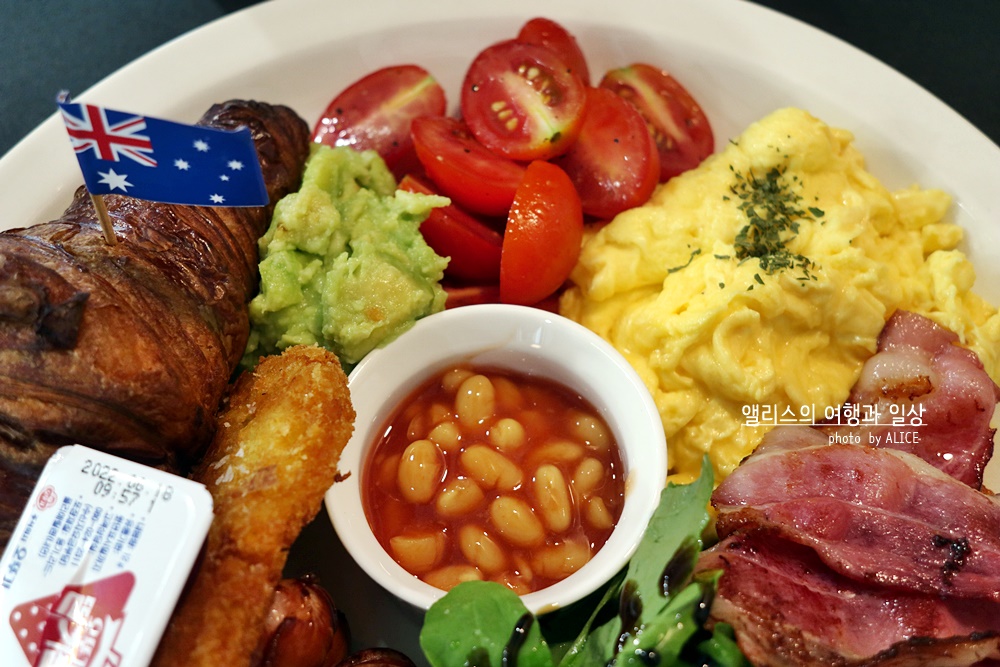 :크루아상, 스크램블 에그, 해시브라운, 베이컨, 매쉬드 아보카도, 소시지, 방울토마토, 베이크드 빈, 루꼴라