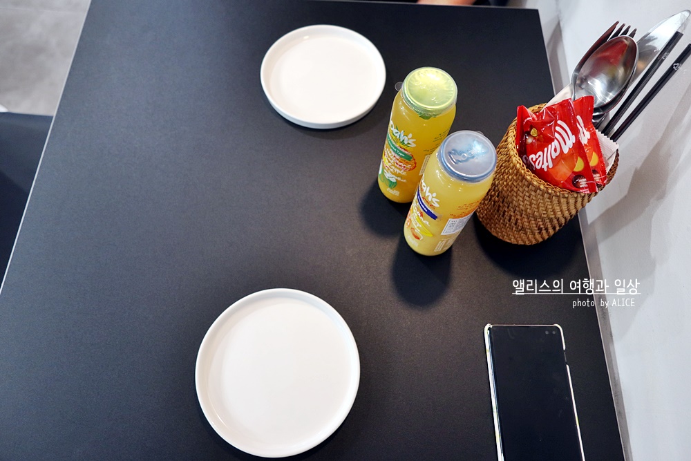 애플바나나와 넥타린 코코넛워터가 도착하고, 몰티즈와 티슈 그리고 수저세트가 도착했다. 기본 세팅이 끝나고 음식이 완성되면 음식 역시 빠르게 서빙된다.