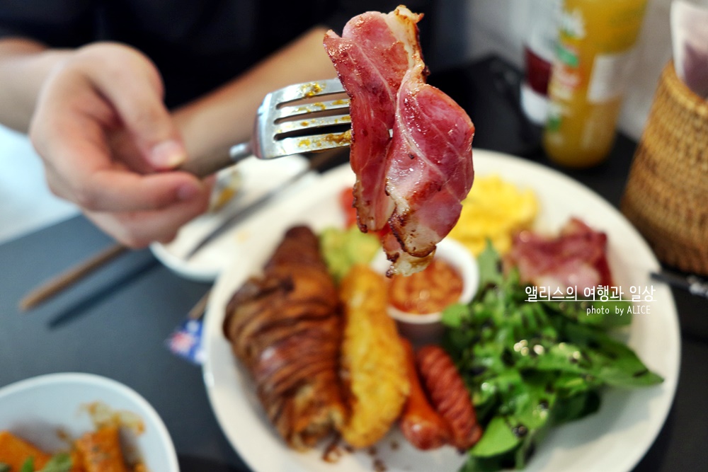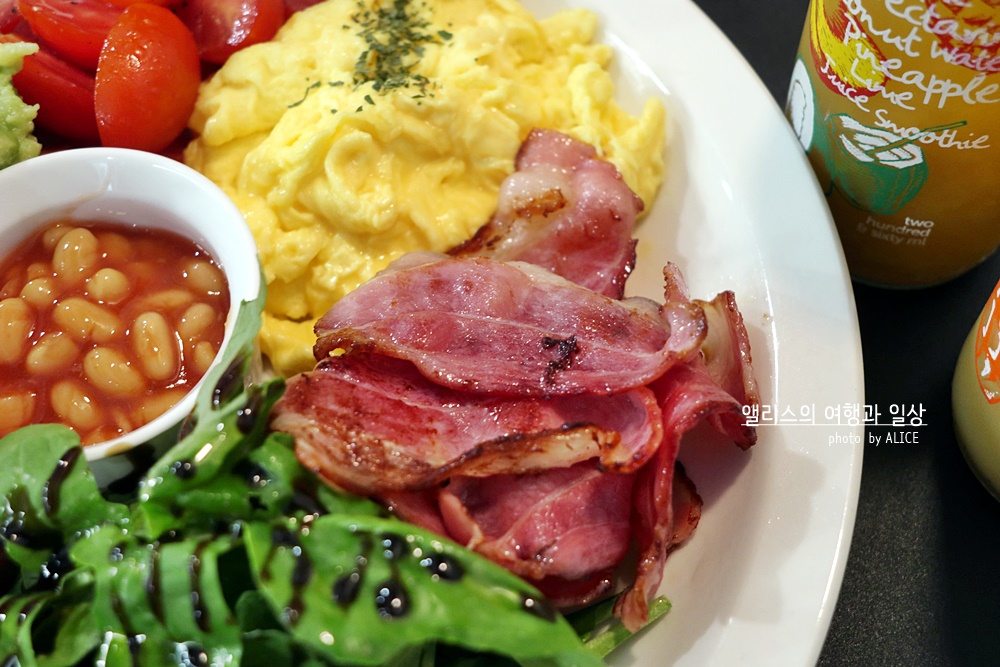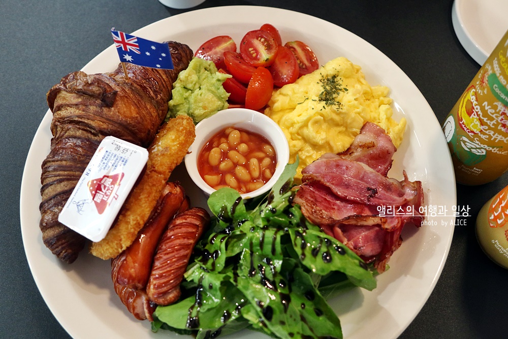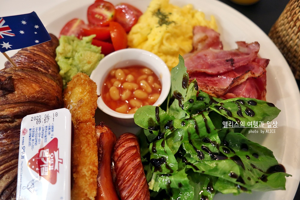 :크루아상, 스크램블 에그, 해시브라운, 베이컨, 매쉬드 아보카도, 소시지, 방울토마토, 베이크드 빈, 루꼴라