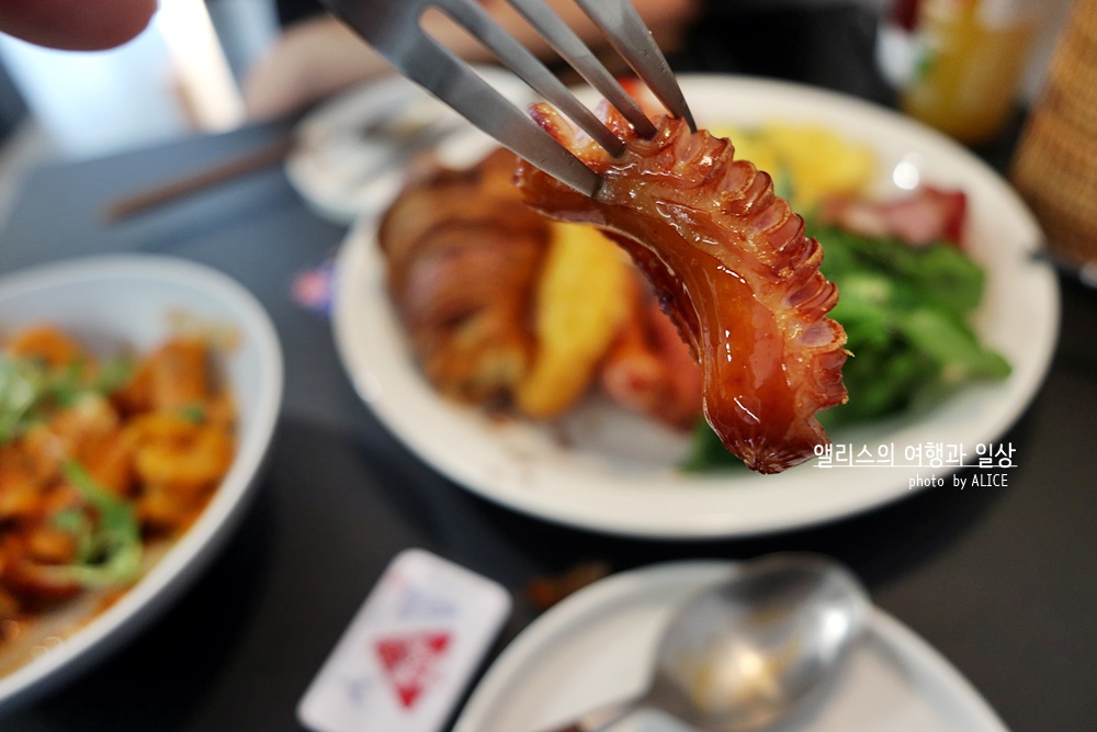 딱 봐도 영양가 가득 채워진 (탄단지 밸런스 굿) 사진에서 모두 표현되지 못한 엄청난 양의 음식이었다. 보기만 해도 배부른 그 느낌에, 색감도 노란/초록/빨간등이 인상적이었다. 스크램플 에그는 생크림을 잘 풀어서 부드러웠고 베이컨은 결코 짠 맛이 아니었다. (좋아좋아!) 해시 포테이토를 적절히 잘라 아보카도를 바르고 그 위에 베이컨을 얹거나 루꼴라를 더하면 맛나다. 크루아상은 같이 서빙된 게살 새우 파스타 소스에 푹 찍어먹는다. 내 입에 예술이다.
