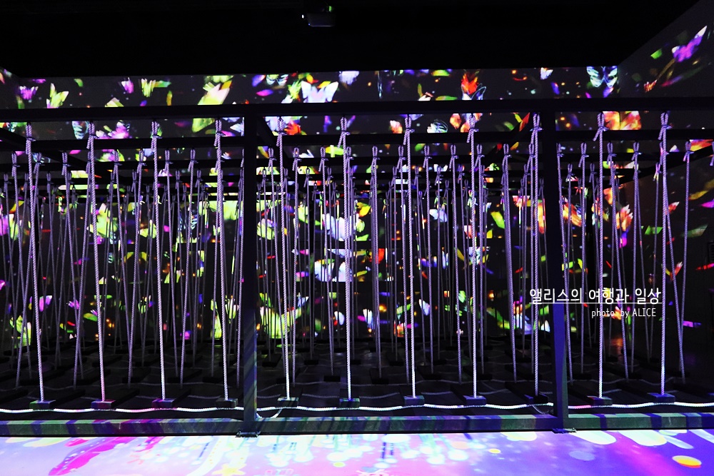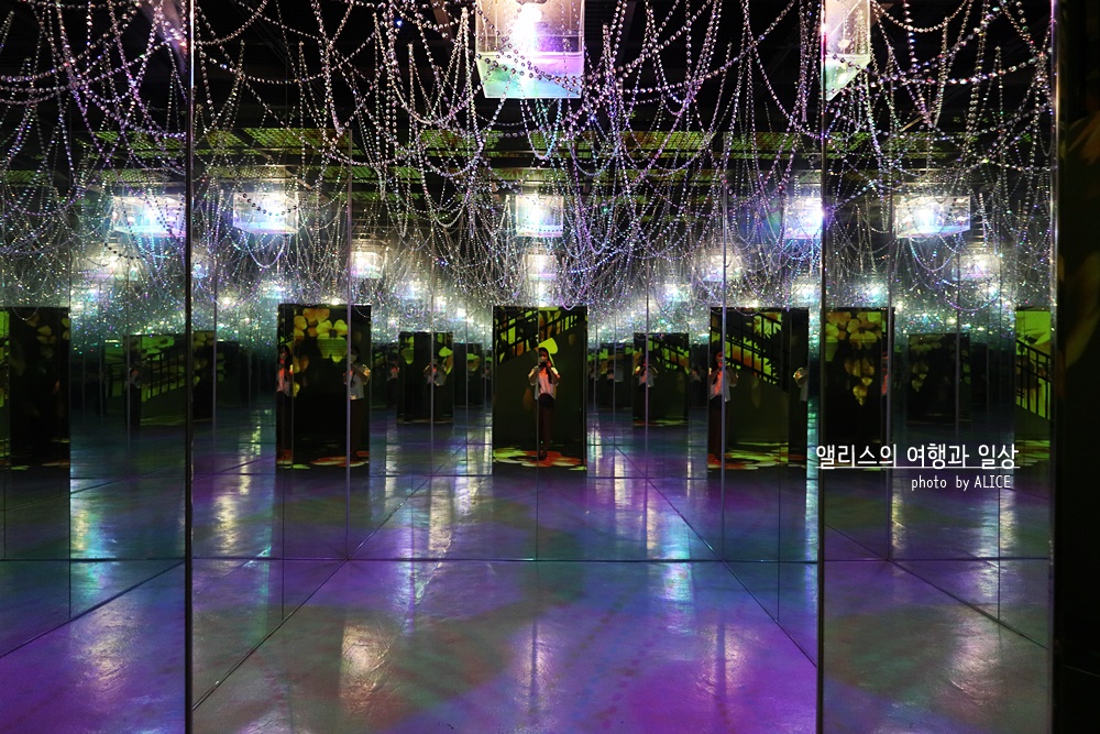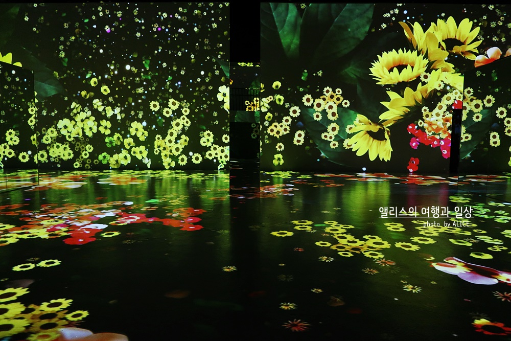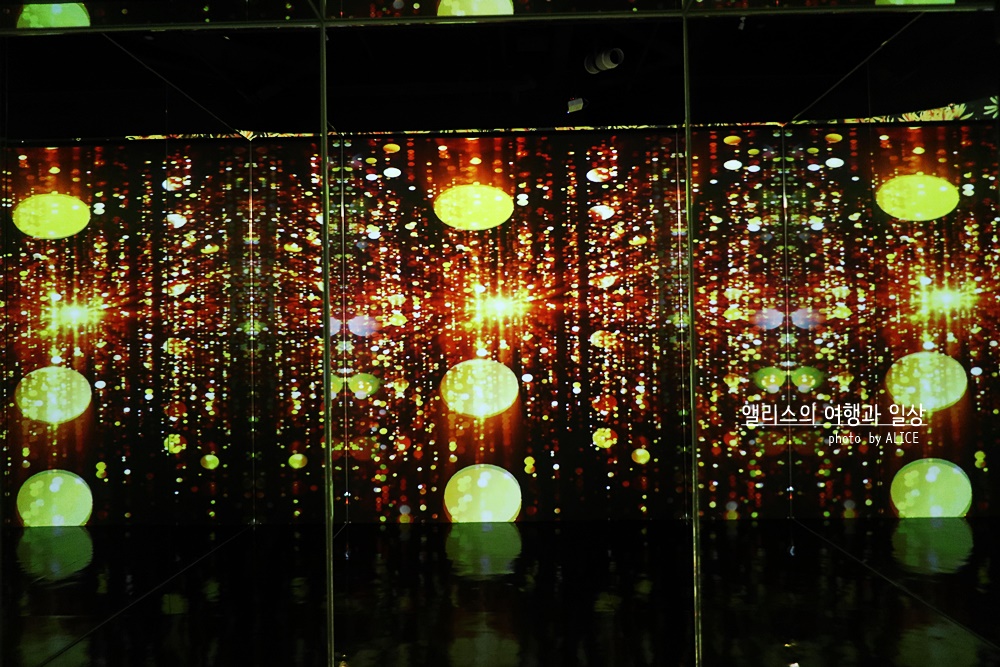 넓은 공간 외에도 작은 공간에는 빛과 어둠을 활용한 미디어 전시가 소규모로 진행되고 있었다. 마치 내가 그 화면속에 들어간 듯한 착각을 불러일으키는 효과를 충분히 활용하고 있어 사진에서 묘함이 느껴졌다. 실제 미디어 전시 속에서는 어디가 어디인지 순간 착각이 쉽게 나타날 정도!