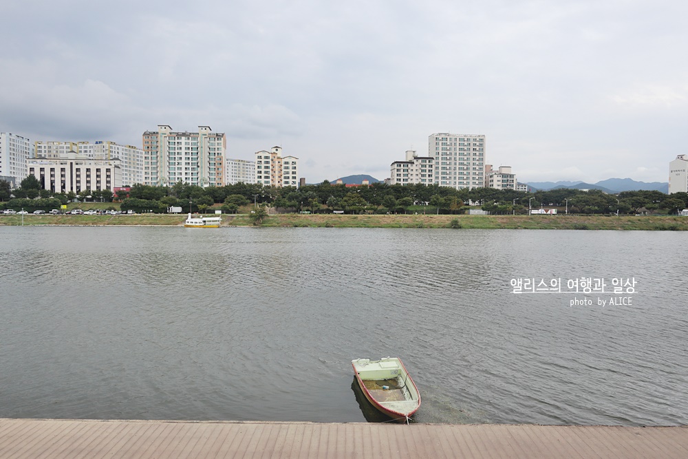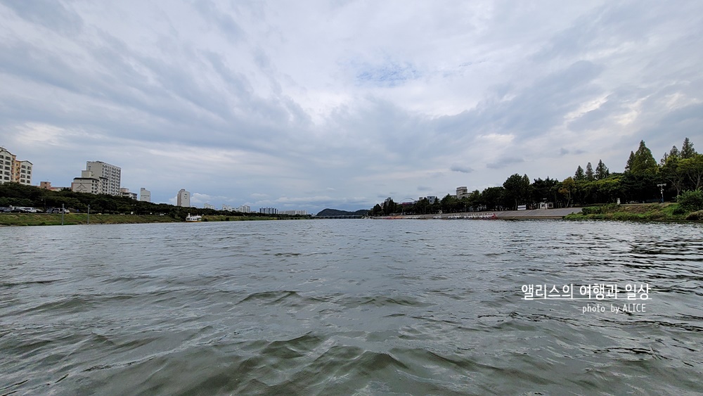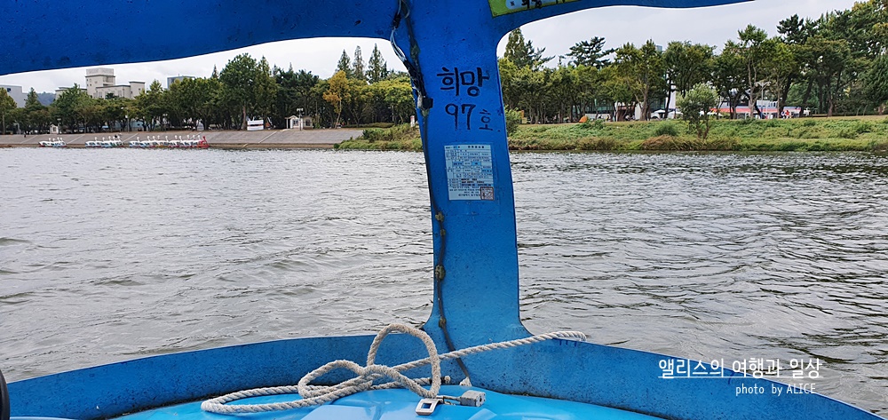 흐린 날씨여도 강물이 흐르는 방향과 거슬러 가기도 하고 같이 맞춰 가기도 하다보면 금새 시간이 흘렀다. 아주 전통적인 페달 오리배였다면 등에 땀나도록 발을 굴려야했겠지만, 자동오리배 덕분에 핸들외에는 대단히 신경쓸 것도 없었고 힘든 것도 없었다. 가끔 물 위로 튀어오르는 제법 큰, 성인 팔뚝만한 물고기를 볼 수 있는 이벤트(?)도 나름 있었다. 동촌유원지를 천천히 걷는 산책도 좋지만 물위의 산책은 자동오리배로 해보는 것도 추천~!