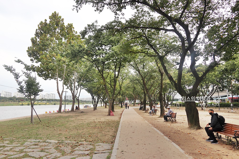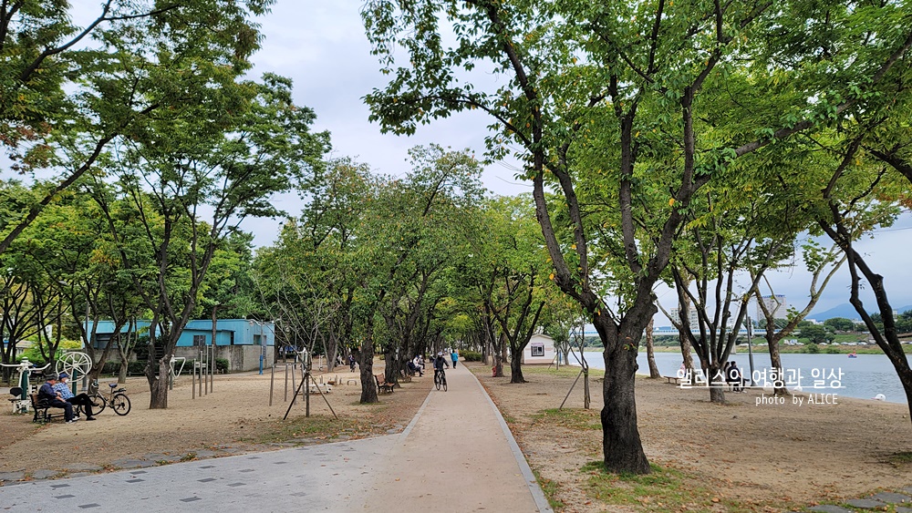 동촌유원지가 산책코스로 참 좋았던 것은 큰 나무도 있고 금호강도 흐르고 걷기 편하게 길정비도 잘 되어있었다. 근처에 카페도 많으니 잠시 카페인 충전도 얼마든지 가능했고, 생활운동기구도 있어서 몸을 풀기에도 좋았다.