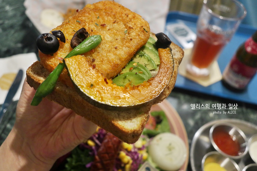 식빵 두 장이 있는데, 이 식빵도 살짝 구워서 나오기 때문에 식빵 본연의맛을 잘 살렸다. 자 그렇다면 이 멋진 브런치를 어떻게 먹으면 될까? 아주 간단하다. 식빵 두 장을 활용하면 된다. 식빵을 한 장을 그대로 들어보면 그 위에 얹어진 각종 구운채소와 함께 들고 먹을 수 있다. 그대로 먹어도 좋고, 그 위에 다른 재료를 얹어서 먹어도 좋다.