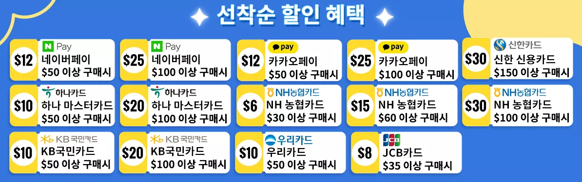 ④ 농협카드: 30달러 이상 결제시 6달러 / 60달러 이상 결제시 15달러 할인 (선착순) / 100달러 이상 결제시 20달러 할인 (선착순)