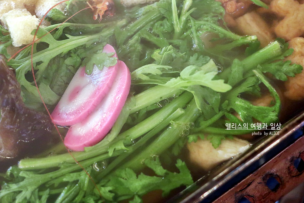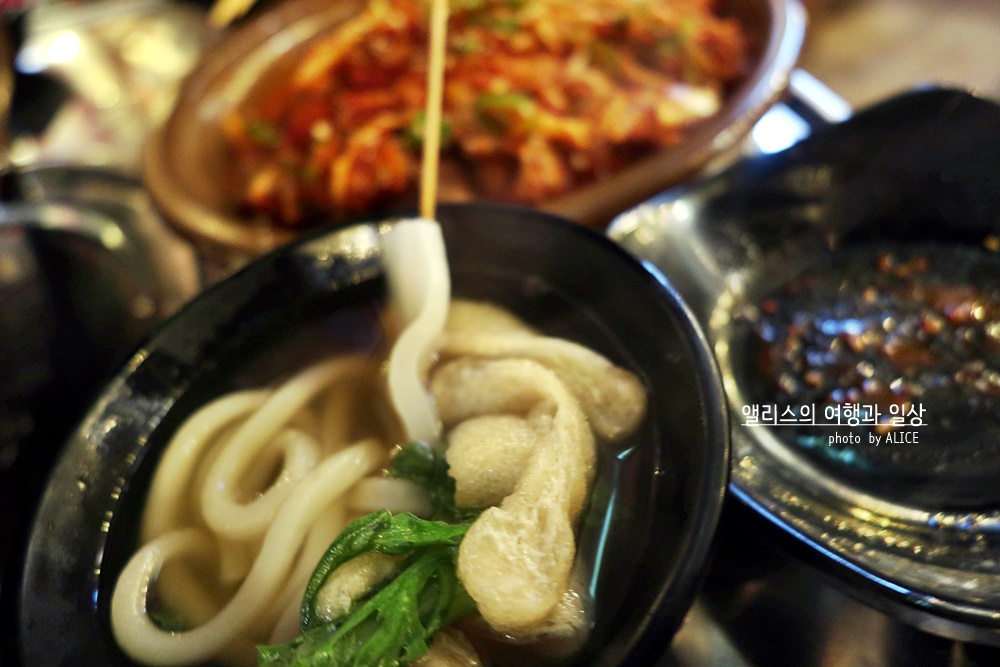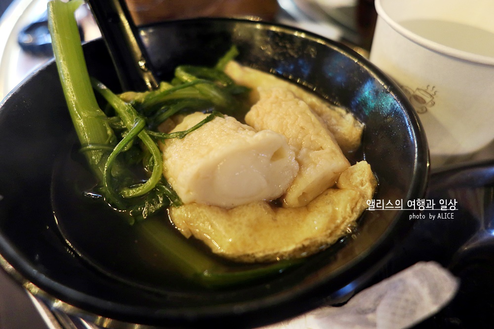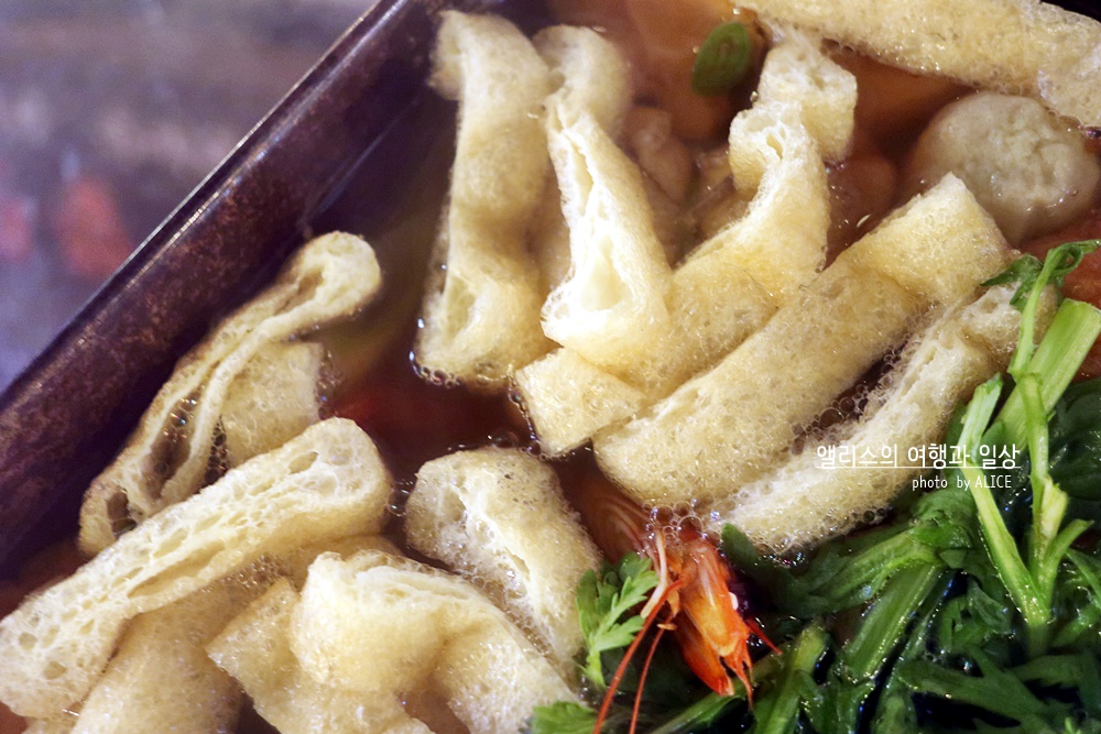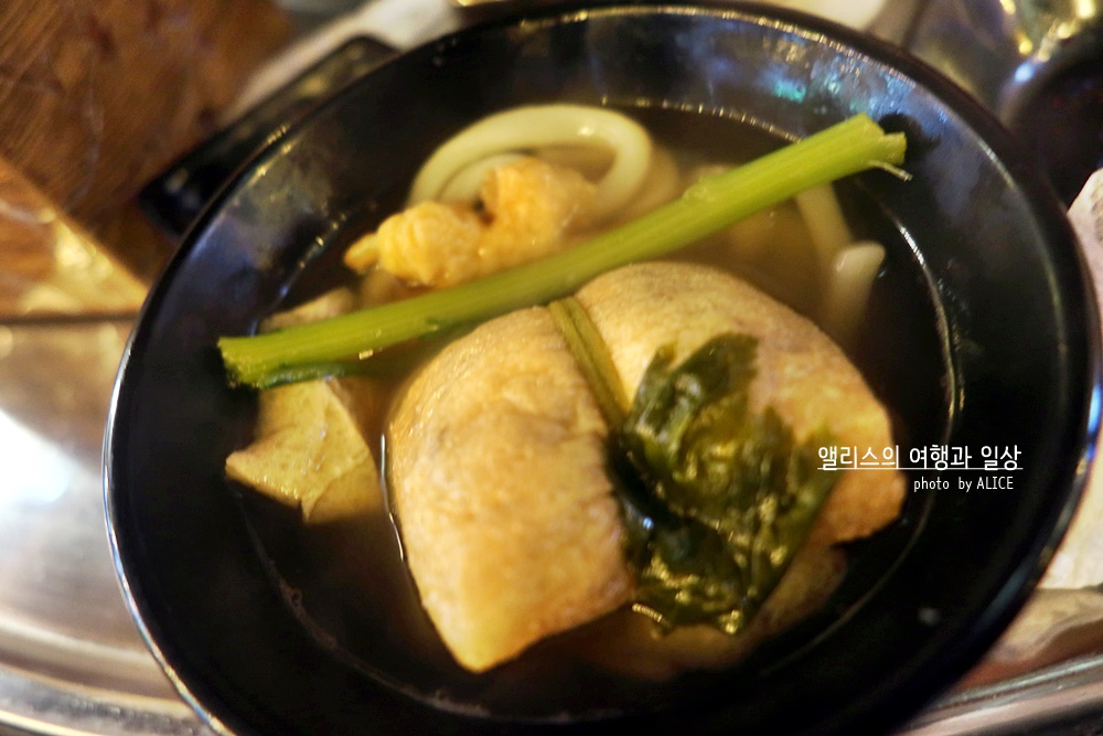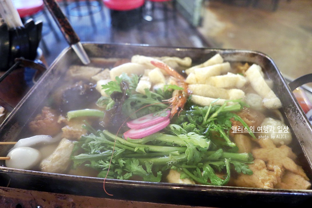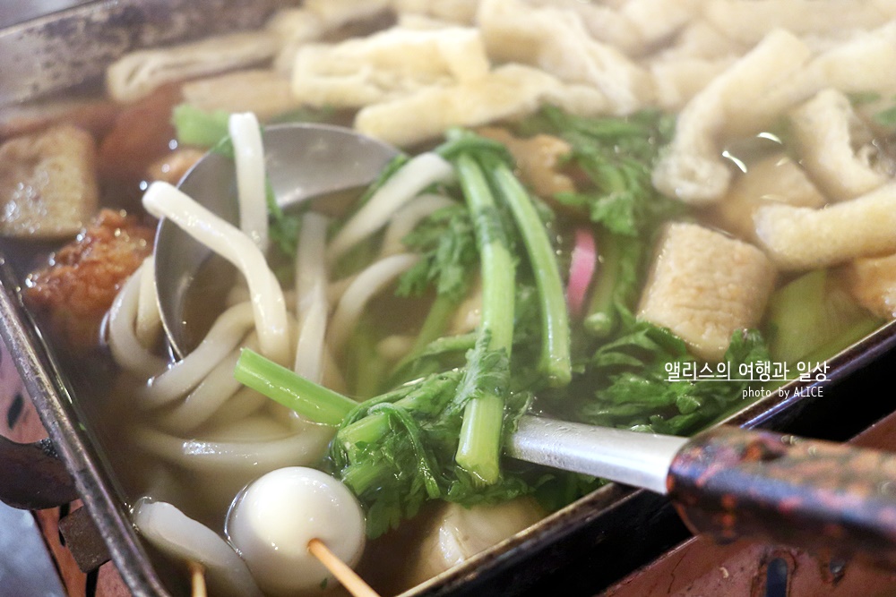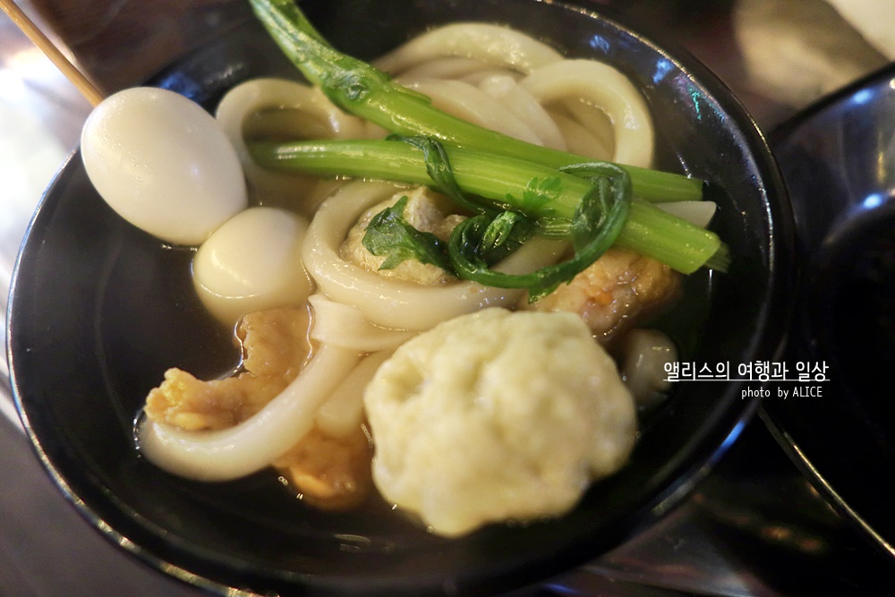 토핑을 선택해보자. 어묵만 덜어낸다면 그 접시는 어묵탕이 될것이고, 우동면을 덜어내면 우동그릇이 완성된다. 물론 유부주머니를 덜어낸다면 별미가 완성되기도. 어묵 종류도 다양하고 쑥갓도 틈틈히 덜어서 같이 먹으면 입맛을 살리기에 좋다. 어묵 종류가 다양하니 무슨맛인가 호기심에 도전을 외치며 한입씩 먹으며 "음, 이건 떡이 들었군, 음 이건 안에 치즈가 들었어!"라며 탐미하는 재미도 있다.