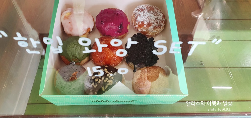 한 박스에 9개의 도너츠가 들어가며, 크기는 본 도너츠보다는 작다. 하지만 이름에서 유추하듯이 "딱 한입 크기"는 절대 아니다. 내가 볼 때는 "세 입 크기 정도?!" 보통 한입 크기라고 하면 대표적으로 먼치킨 크기를 생각해낼 수 있겠지만, 이곳은 먼치킨보다는 컸고, 본 도너츠보다 작았다. 약간 미디엄 사이즈의 도너츠정도라고 생각하면 쉽게 떠올릴 수 있을 것 같다. 총 10가지 중에서 9가지 정도가 들어가는 사이즈로 구성된 한 입 와왕 세트를 나는 강력히 추천하는 이유는 정말 다양한 도너츠를 맛볼 수 있고 무엇을 고를지 고민할 필요가 없기 때문이다. 그래서 나는 이걸로 선택하는 편이다.