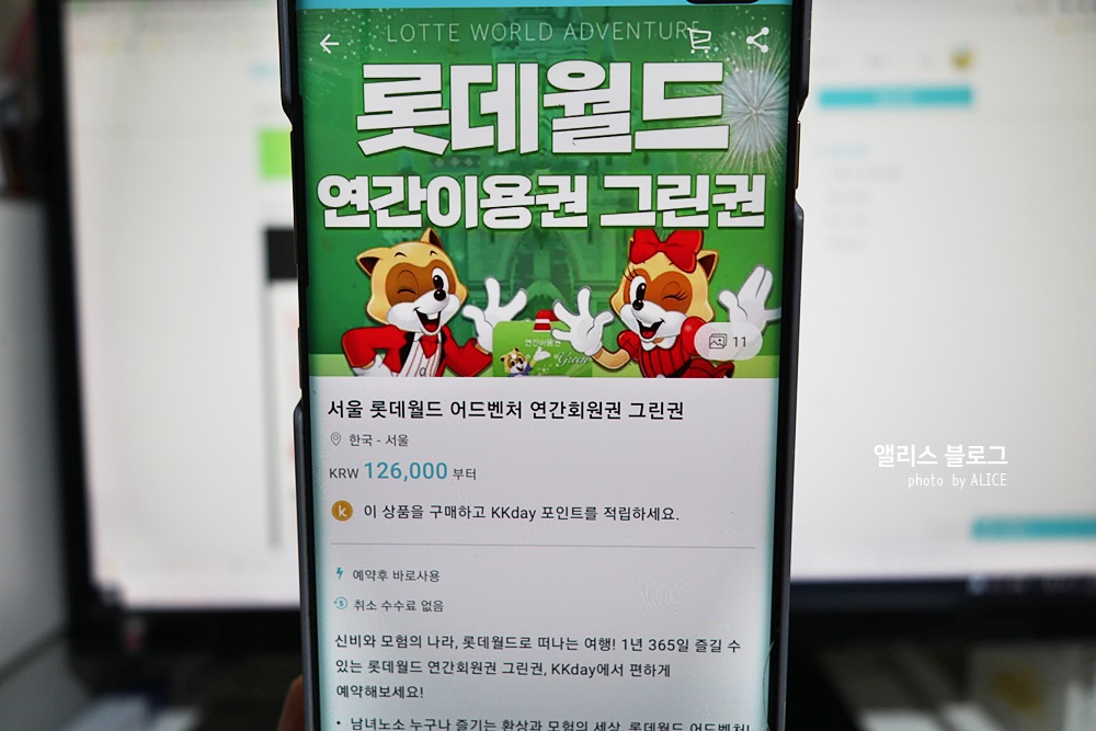 kkday에서 롯데월드 어드밴쳐 연간회원권(그린권)구매시 즉시 확정되고 바우처 역시 즉시 발송(카카오톡 또는 문자)된다. (단 전송된 바우처를 등록하면 환불불가)