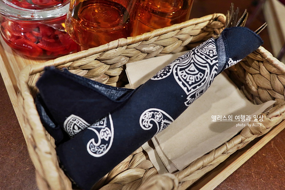 수저도 이렇게 2인용으로 깔끔한 수건에 감싸져있어서 먼지가 들어가지 않기에 적합했다. 절임채소도 기본적으로 제공되니 필요한 만큼 덜어서 먹으면 된다.