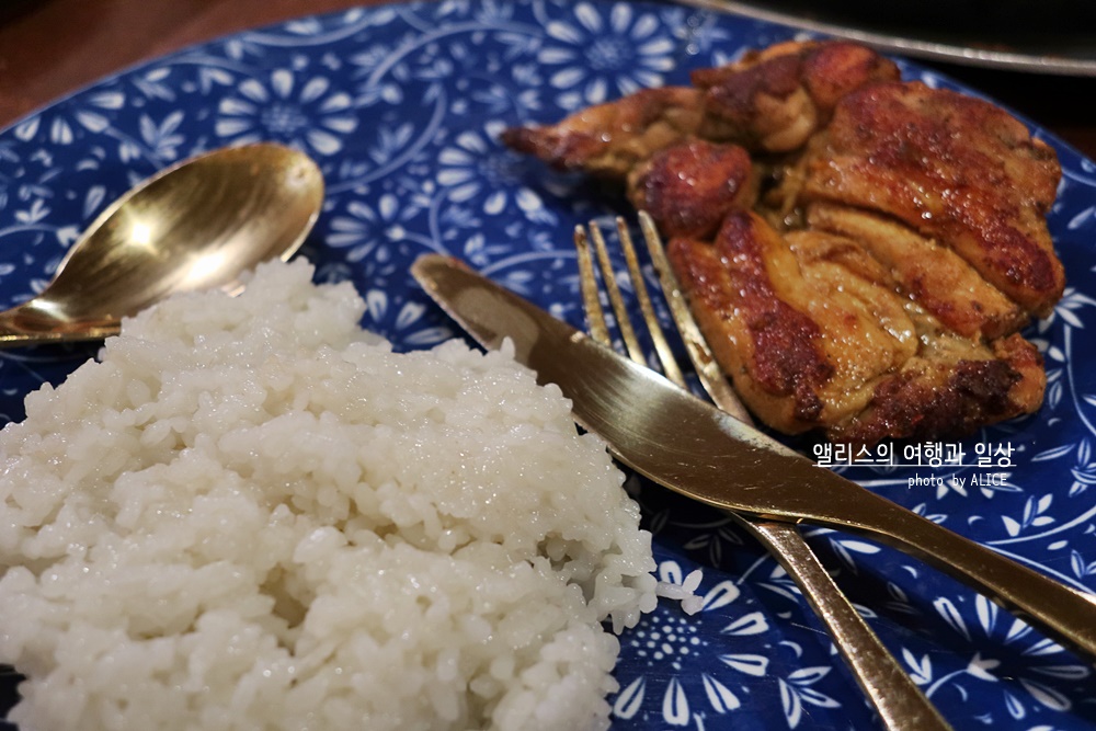 치킨 또는 돼지고기 혹은 그 둘다 선택이 가능하다. 나는 치킨으로 선택했다. 처음에 치킨이 보이지 않아서 메뉴 주문이 잘못 된 것인가 싶었는데 알고보니 치킨은 접시 가장 아래에 깔려있었다. 포크를 집어서 치킨을 꺼내보니 이거 크기가 절대 작지 않았다. 포크에 끌려나오는 치킨을 힘겹게 꺼내서 밥 접시 남는 공간에 두니 딱 맞았다. 고기도 크고 퍽퍽한 부위가 아닌 부드러운 부위에 먹기 좋게 손질된 닭고기였다.