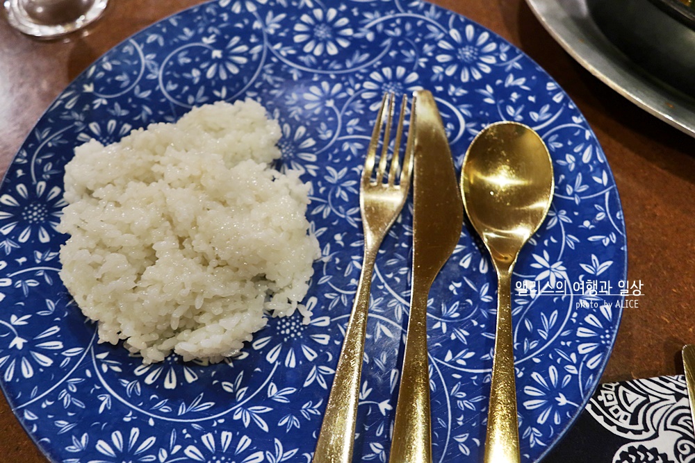 넓은 그릇에 밥이 나오는 건 남는 공간에 카레에 있는 치킨을 꺼내서 편하게 썰어먹으라는 의미로 넓은 접시가 제공된다. 이 부분 참고하시길!