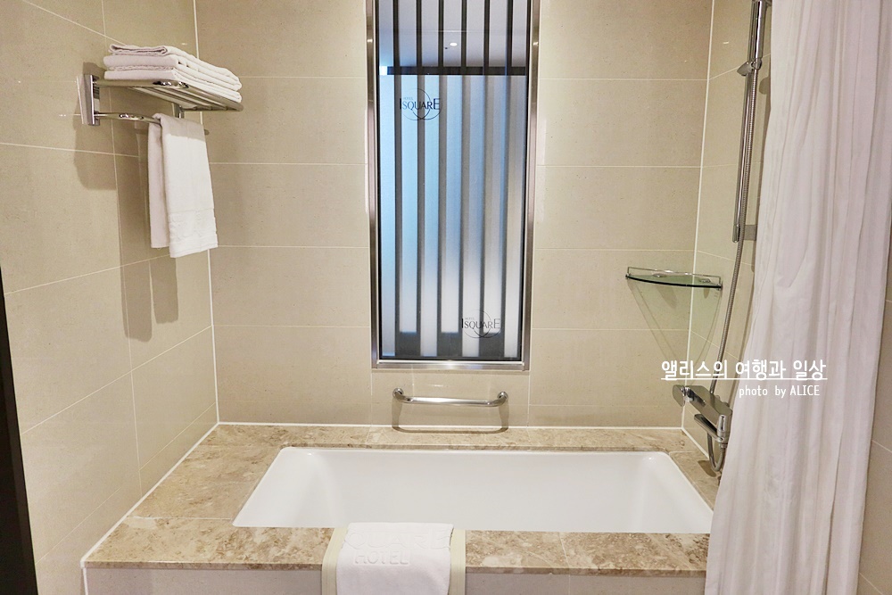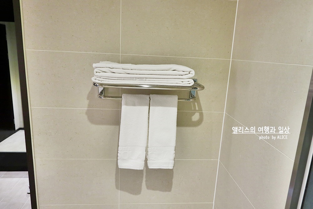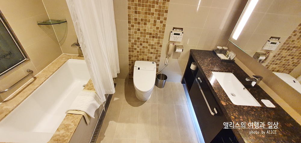 욕조가 있어서 매우 좋았지만, 샤워커텐을 확인하고 더 놀라웠다. 보통 샤워커텐이 있으면 이걸 관리하는 게 여간 까다로운 것이 아니다. 아무리 신경을 써도 샤워커텐에 배여진 물 냄새를 100% 완벽하게 제거하기란 정말 어려워서 왠만한 호텔에서 어느정도 샤워커텐에서 물 냄새 나는 것을 나는 이해하는 편이다. 그게 아주 심하진 않다면 괜찮다고 생각하는 편인데, 진심 이 욕실에서 샤워커텐에 물 냄새 1도 안난다... 신기할 정도! 그게 참 어렵고 내 코는 정말 예민한 편이라 냄새도 잘 맡는데, 진짜 물냄새 1도 안나더라는... 이게 내가 배정받은 객실이 그렇게 운이 좋았던 것인가 싶었지만, 샤워커텐은 정말 관리가 어려운데 이렇게 물냄새 안나는 경우는 또 처음...!