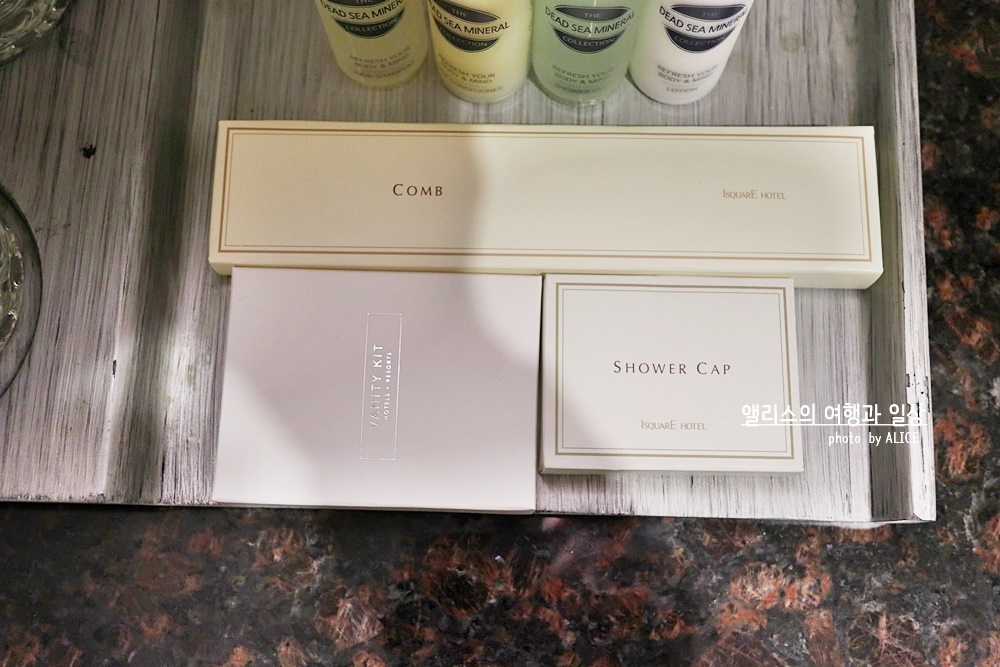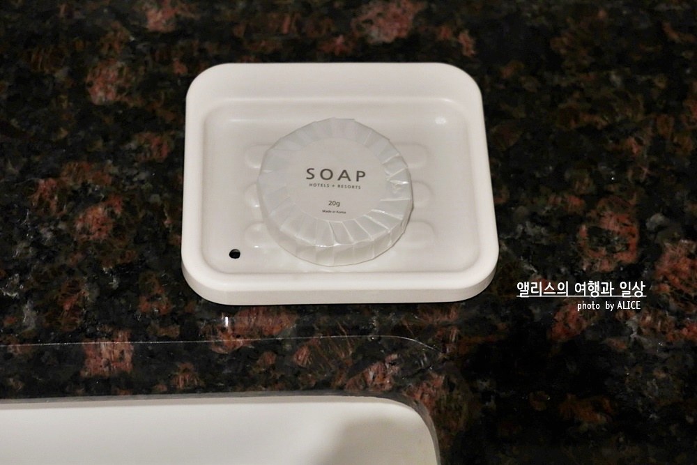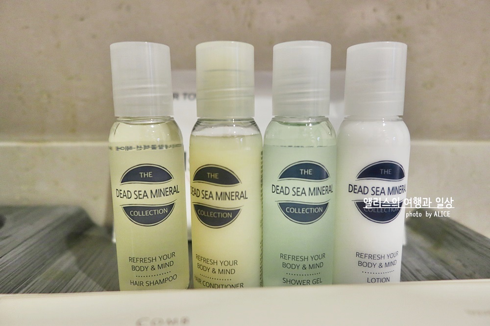 헤어드라이어기는 수납장 아래에, 어매니티는 샤워스펀지/ 샴푸/바디워시/ 바디로션/ 헤어컨디셔너/ 면봉, 머리고무줄, 화장솜/ 샤워캡/ 빗/  비눌 갖춰져 있었다. 아! 치약과 칫솔은 무상 제공하지 않으니 개인이 챙겨야하니 잊지 말자.